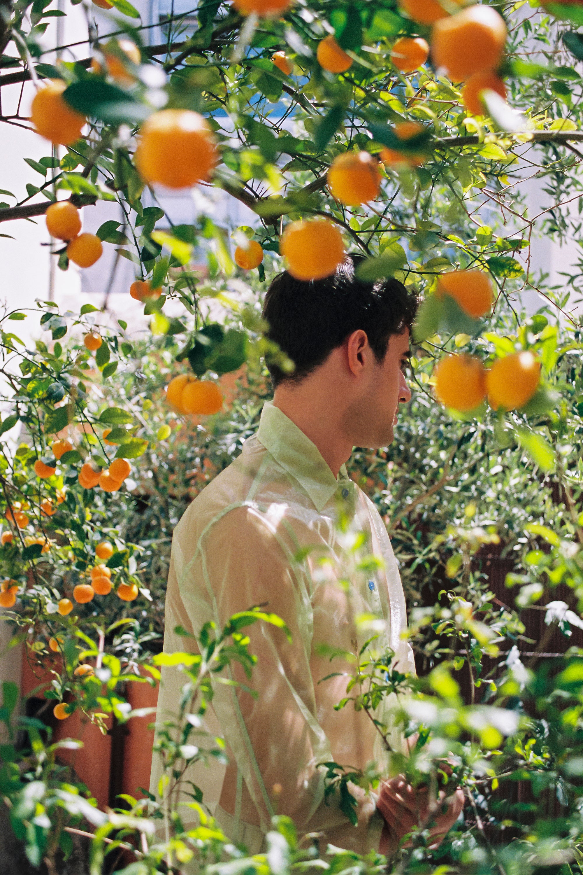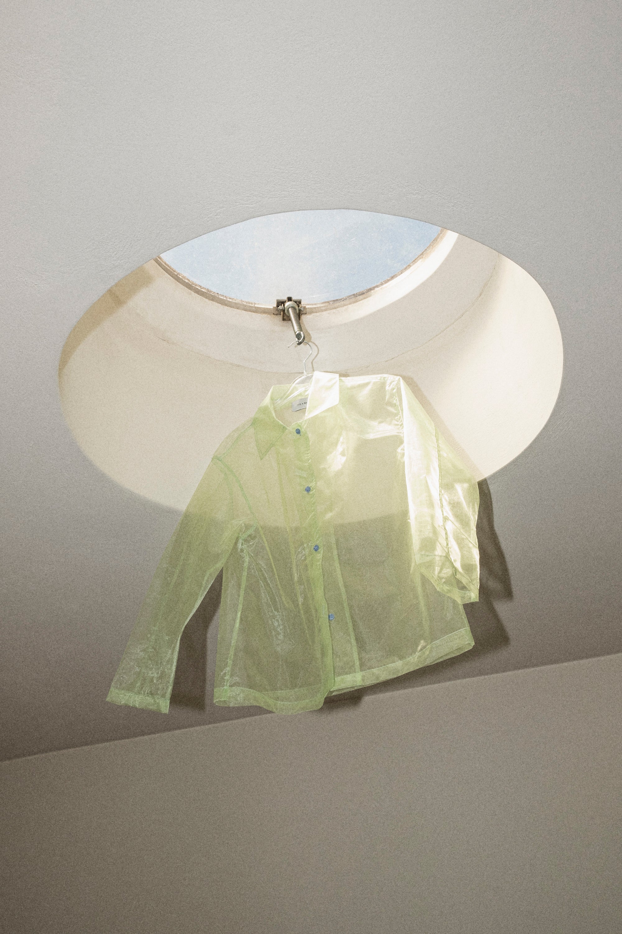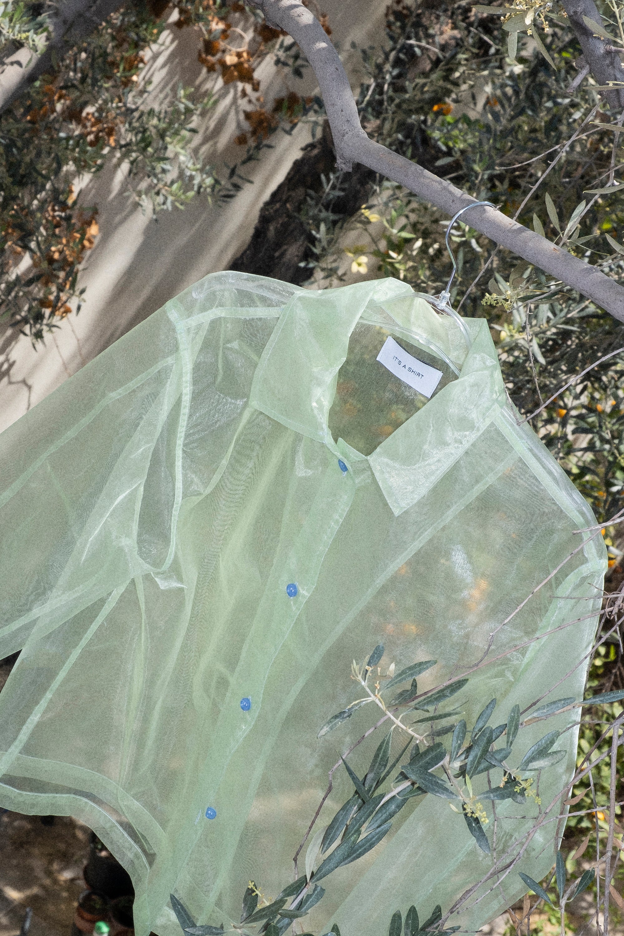 Jellyfish Transparent is a unisex shirt made from see-through organza in green colour. The garment has a light blue stitching across its surface and is finished with the same colour buttons. It has a wide spread collar, a straight hem yet the sleeves are free of cuffs. Limited garments available.