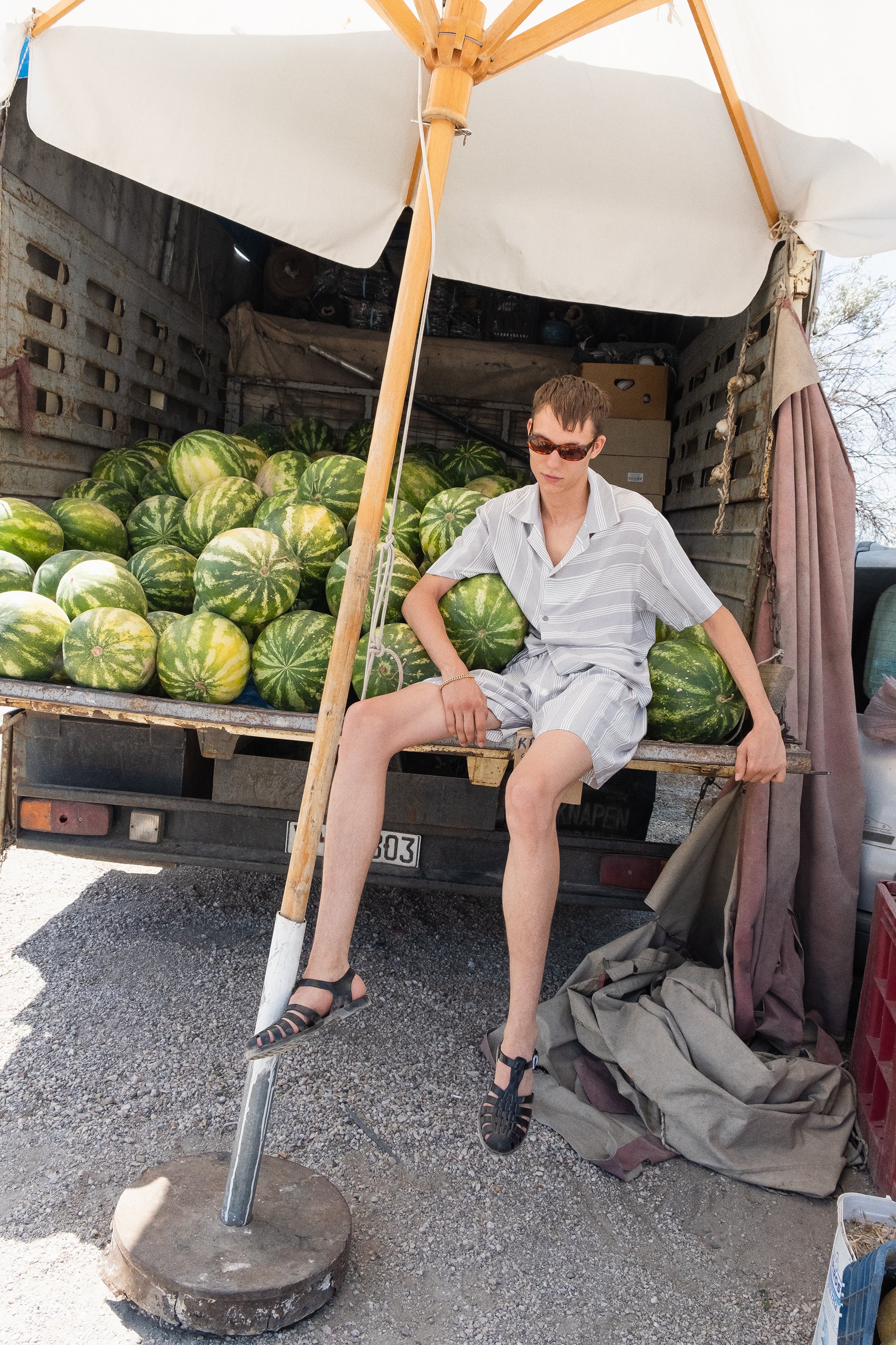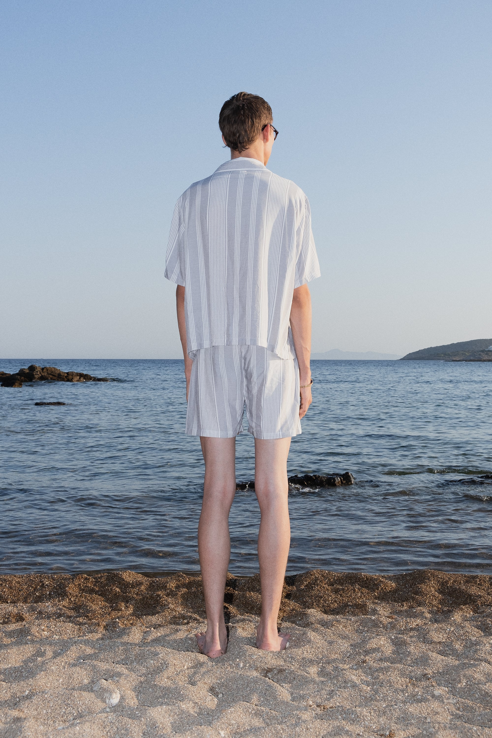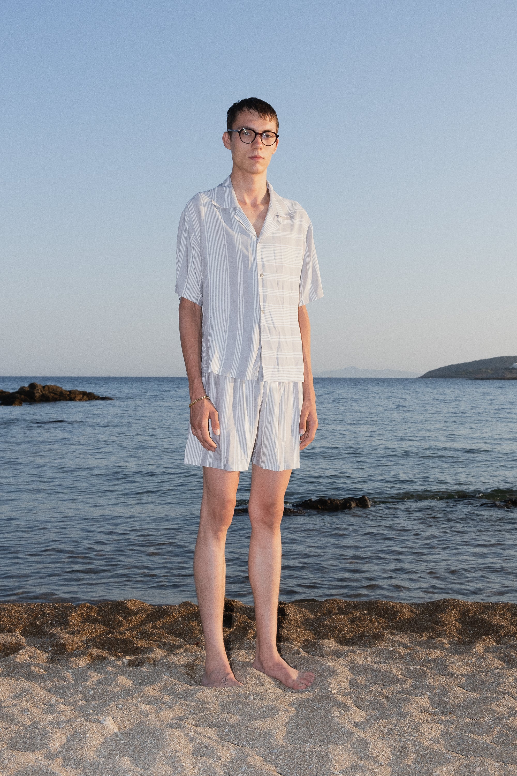 Shorts: The garment has its stripes vertically, it has a loose fit and an elastic waist. On the back, there is a hidden pocket finished with the same button as the shirt's.