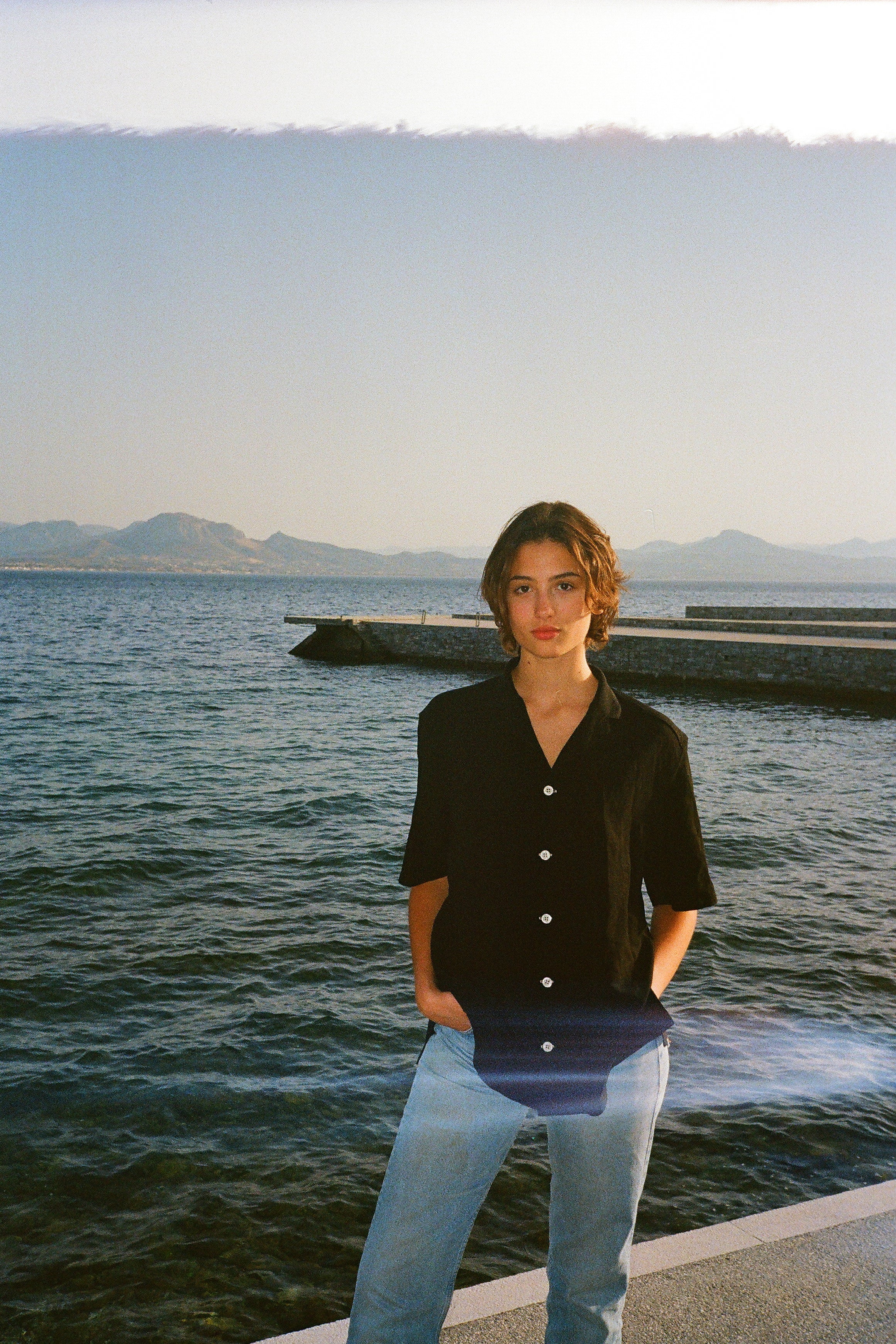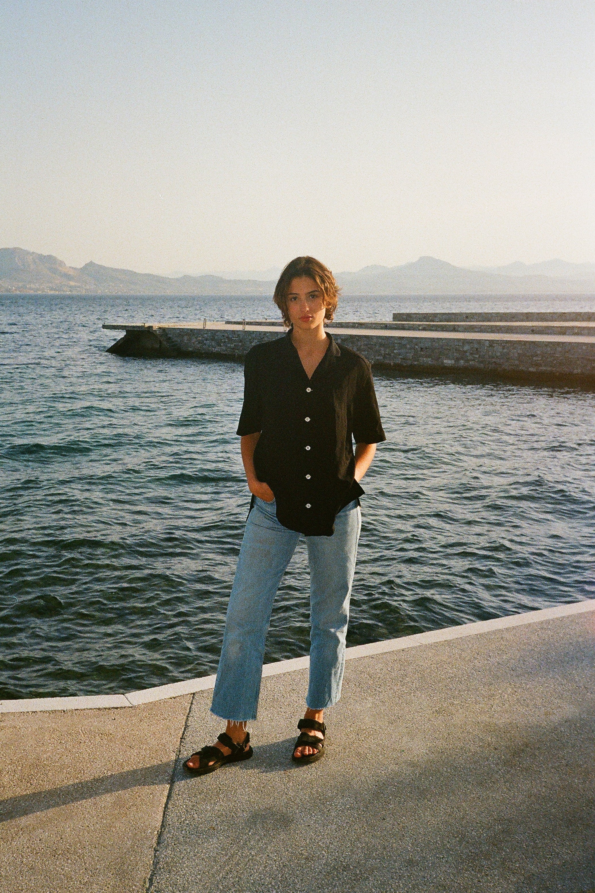 On tour Vietnam is a short sleeve cotton shirt with a unisex, boxy fit owning a delicate wing collar. This garment can be worn open or buttoned up leaving the neck naked during the warm summer days. It has been crafted from greek black linen and finished with dead-stock buttons with contrast buttonholes. Each and every shirt is produced in our family production space located in Athens.
