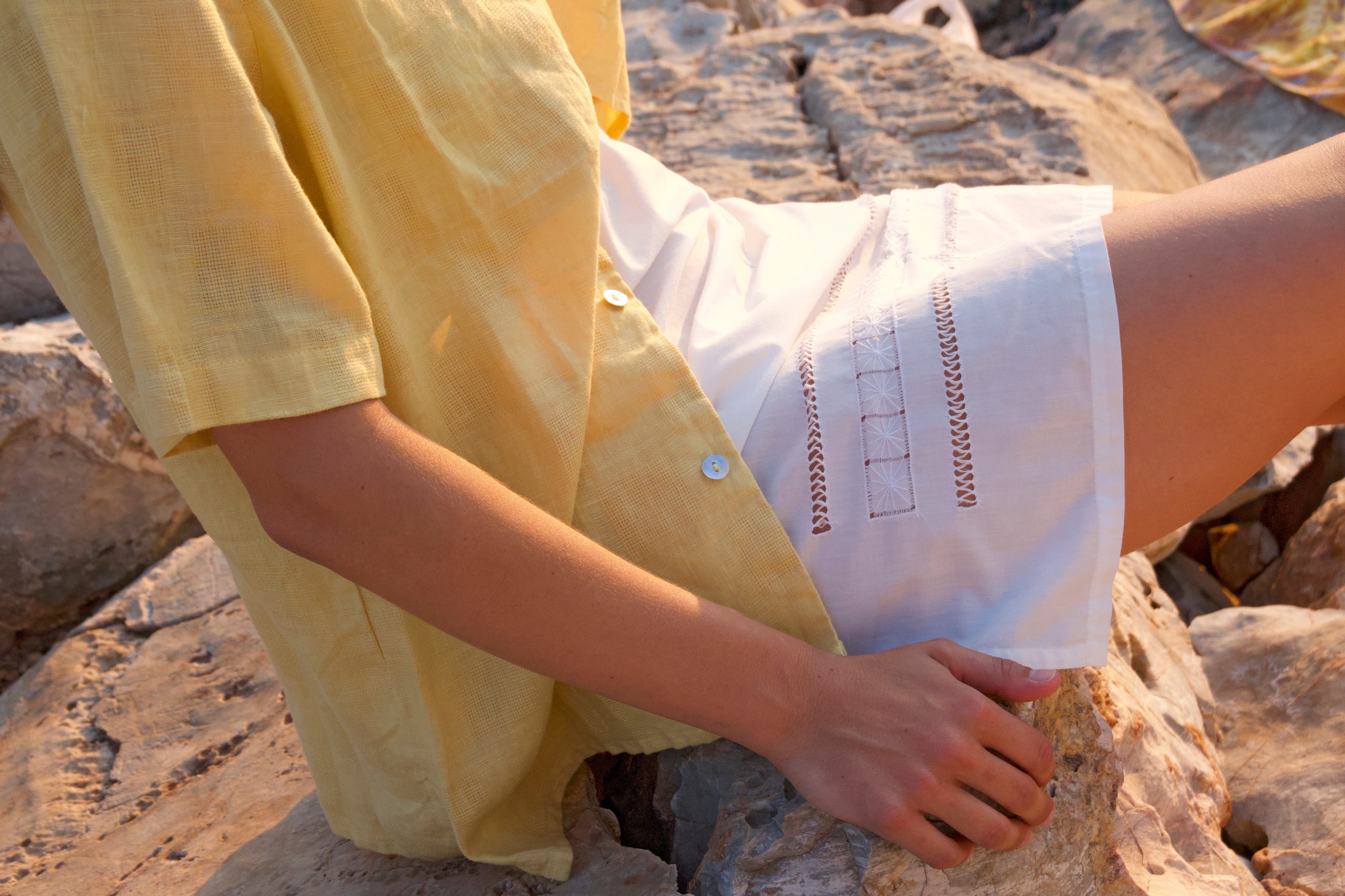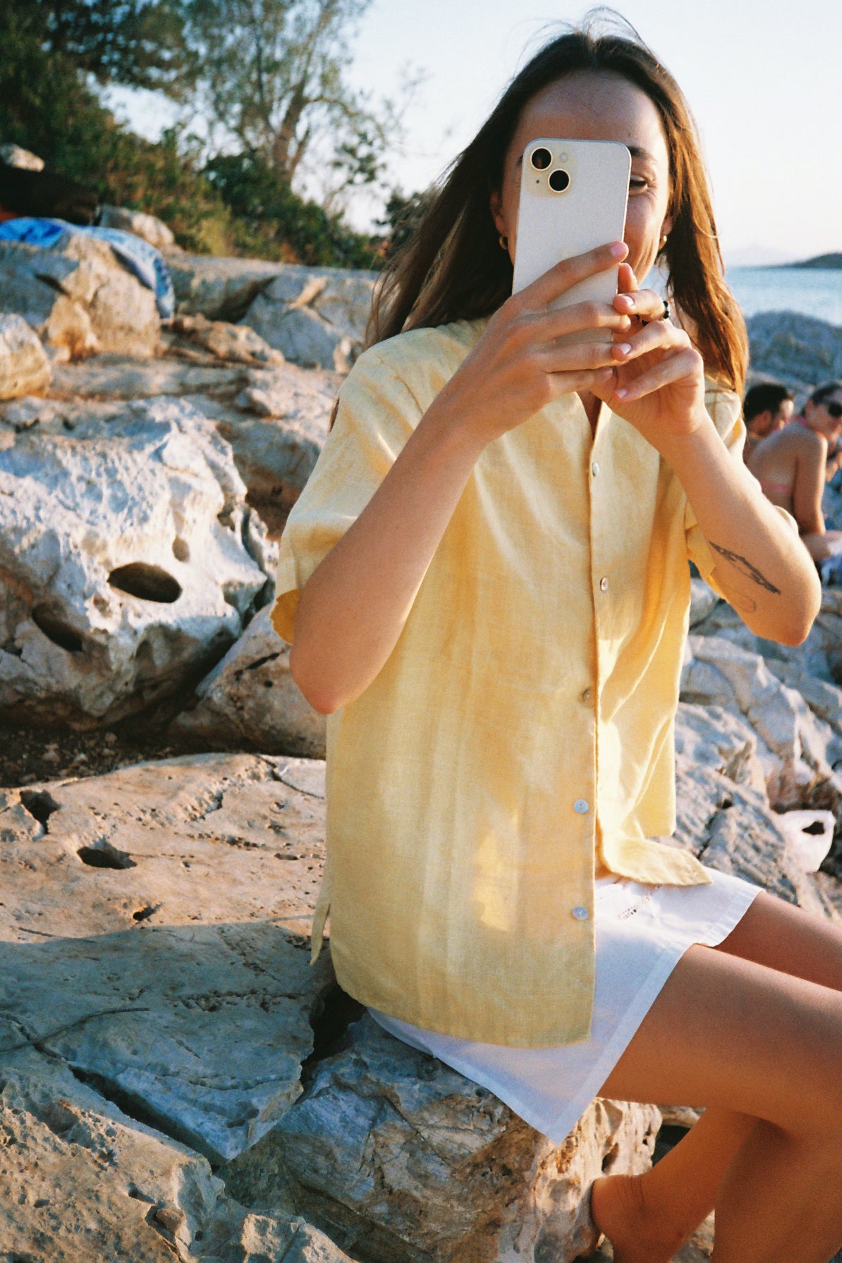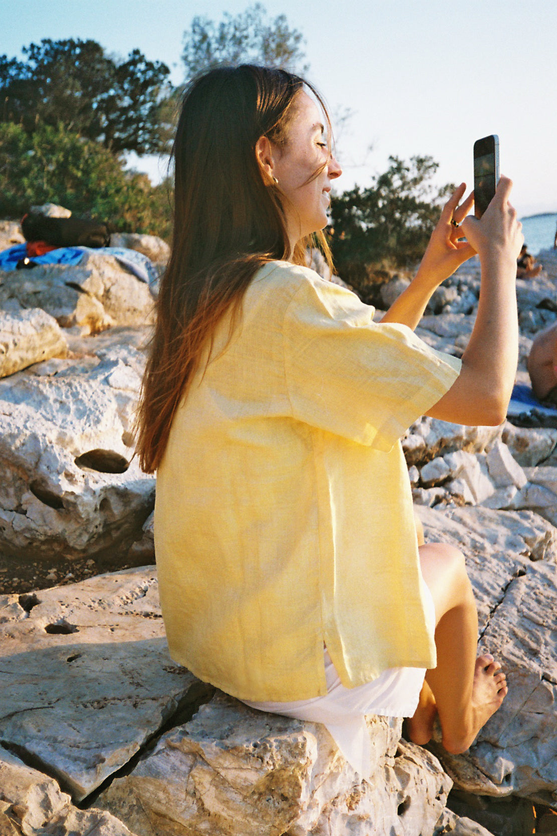 Sunlight is our short-sleeve yellow shirt which owns v-neck collar inspired by the Japanese wafuku robes as well as a boxy fit. The garment is crafted from greek woven linen and is finished with mother of pearl small-sized buttons. The shirt is light and easy-to-wear yet delicate letting the skin breathe during the warm days. Each and every shirt is produced in our small-family-production space.