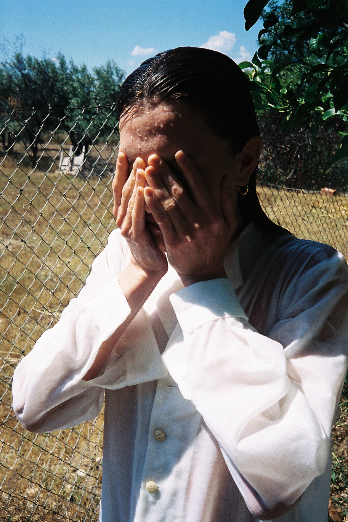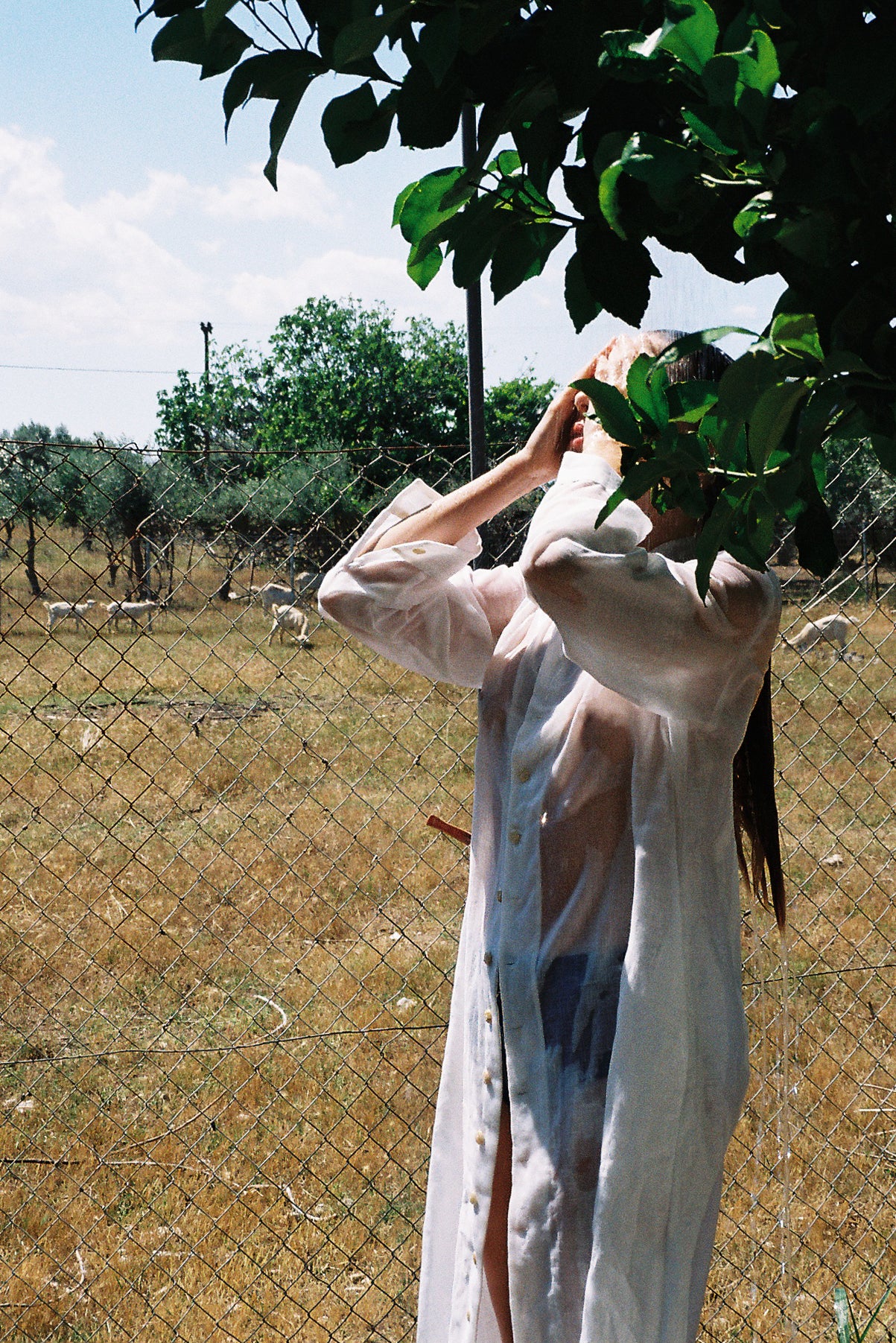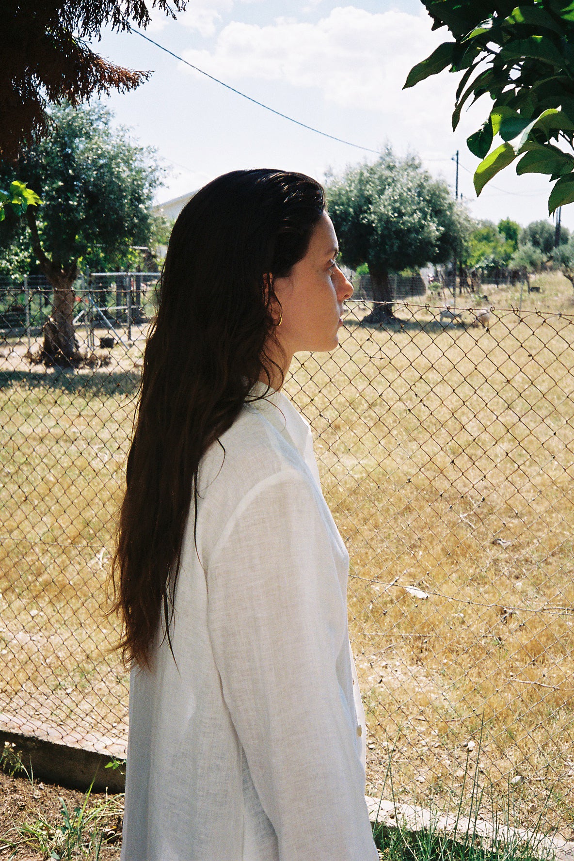 SUNCREAM is a very long shirt made from slightly transparent greek linen in white colour. The shirt's body ends up to a collar and is either standing or folded. The garment is finished with large beige bone buttons. Each garment has been produced and curated in our house in Athens. This shirt is limited and we never do restocks.