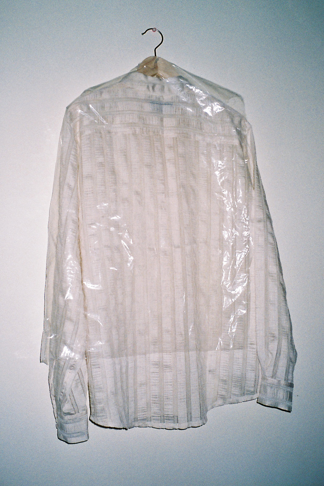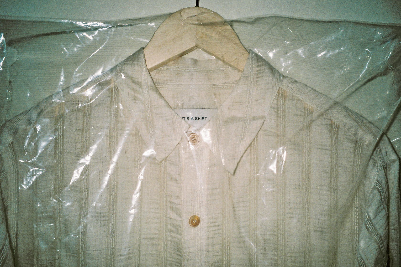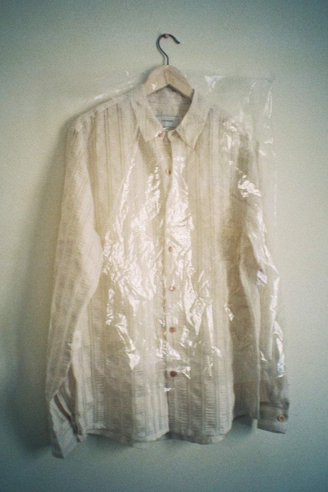 TRANSPARENCY is a delicate long sleeve unisex garment made from french viscose with nylon transparent horizontal lines. Its fabric was found in Attica and is a dead-stock. The shirt carries a classic collar and is finished with pink mother of pearl medium sized buttons. Loose fit. One size. Only 3 shirts available.
