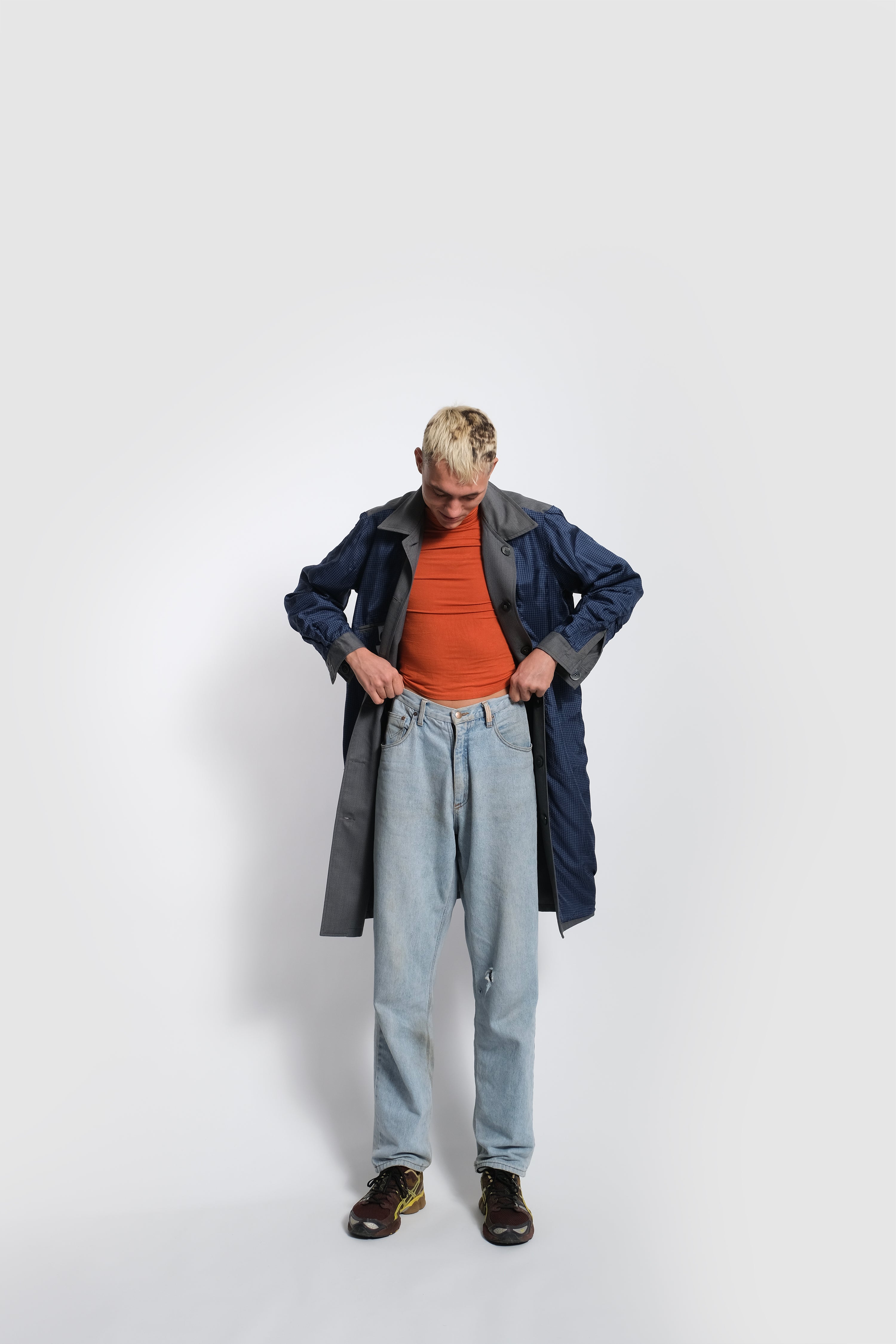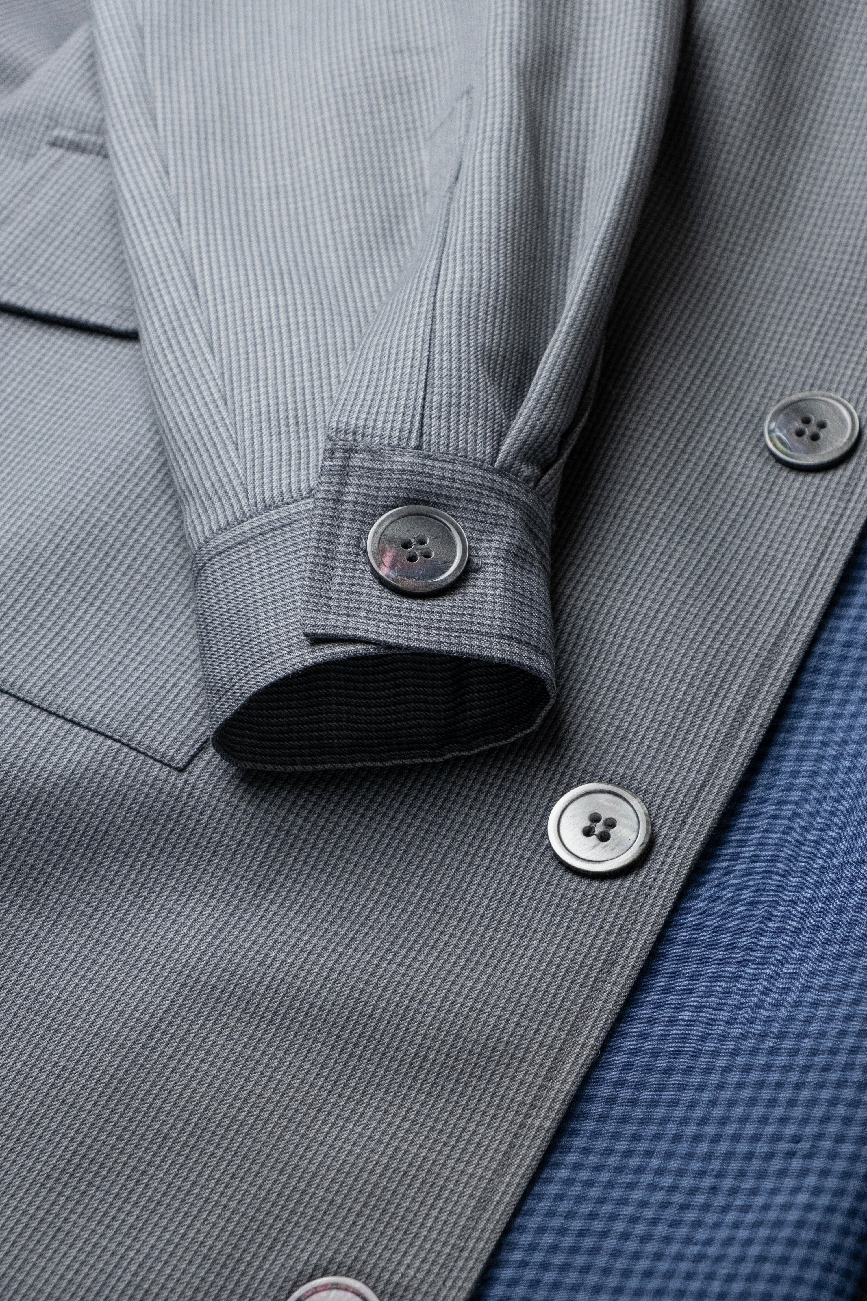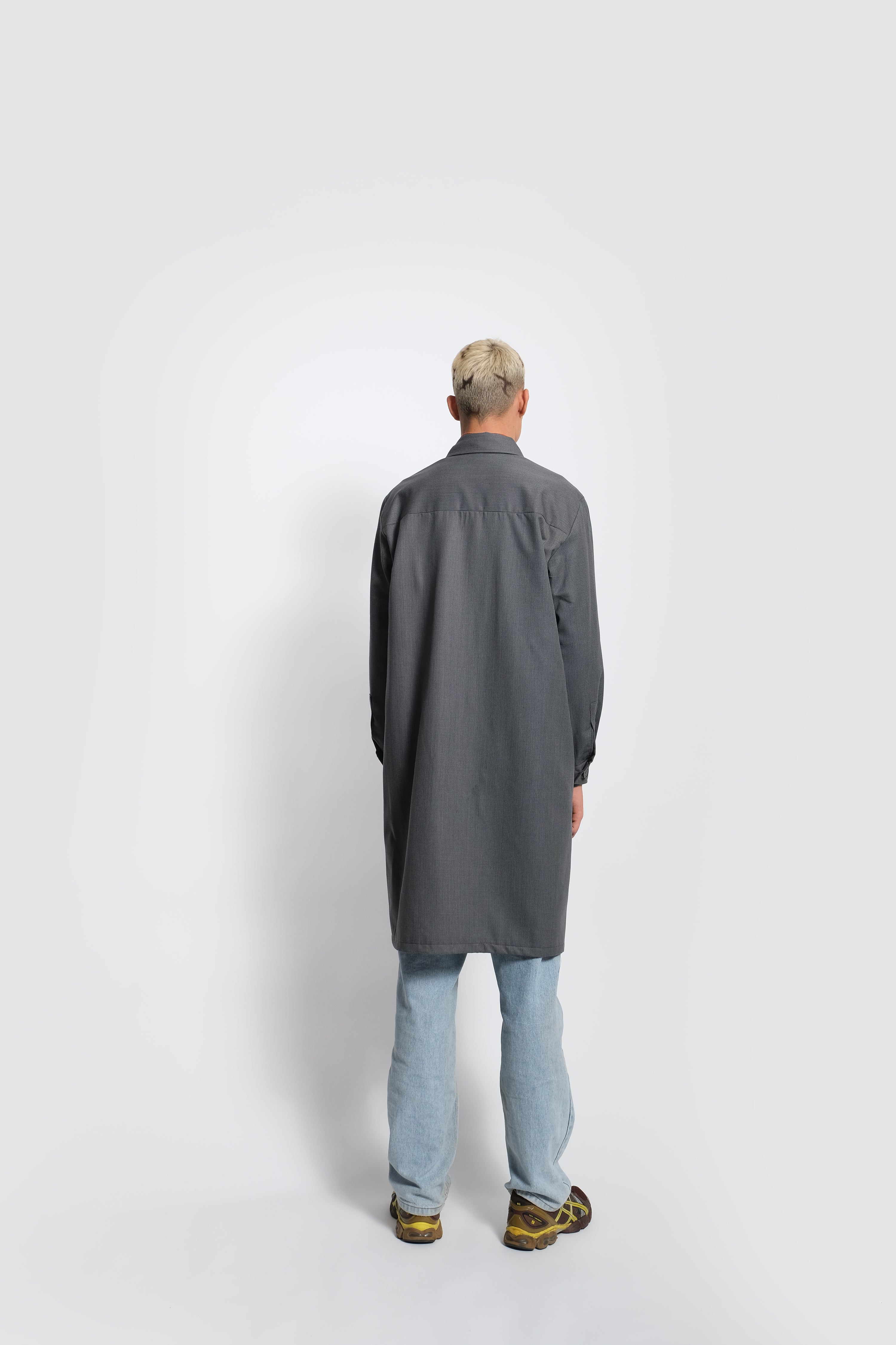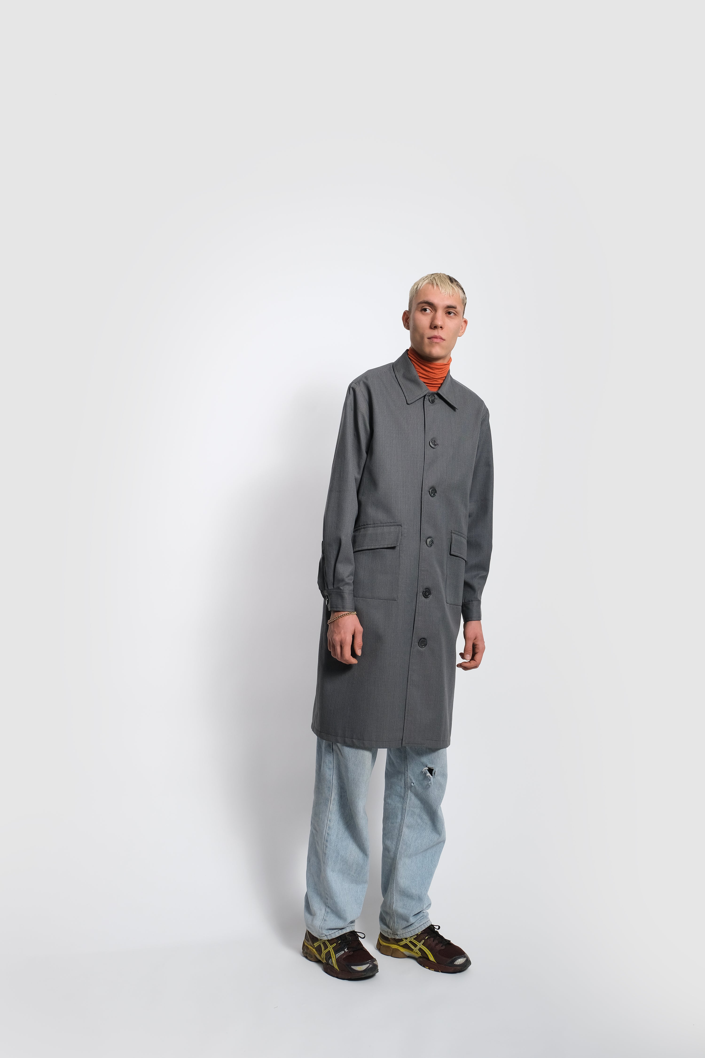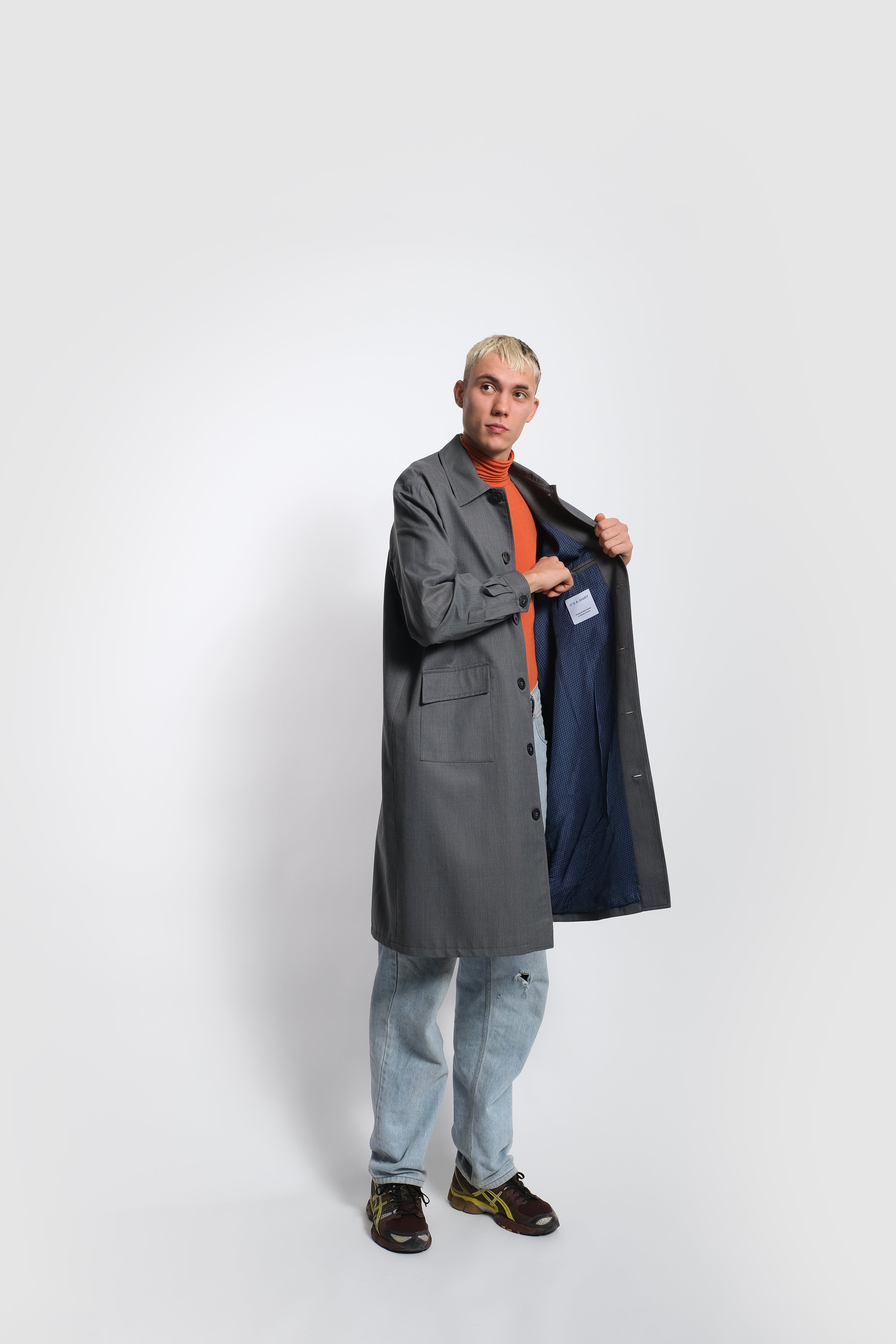 What you see here is a unisex long coat tailored in a premium light grey wool from England, lined with a check blue silk/viscose fabric. It is characterised by a wide spread collar as well as by its sleeves that resemble the ones our classic shirt has. It owns also two flapped pockets and another one placed on its left inner side.