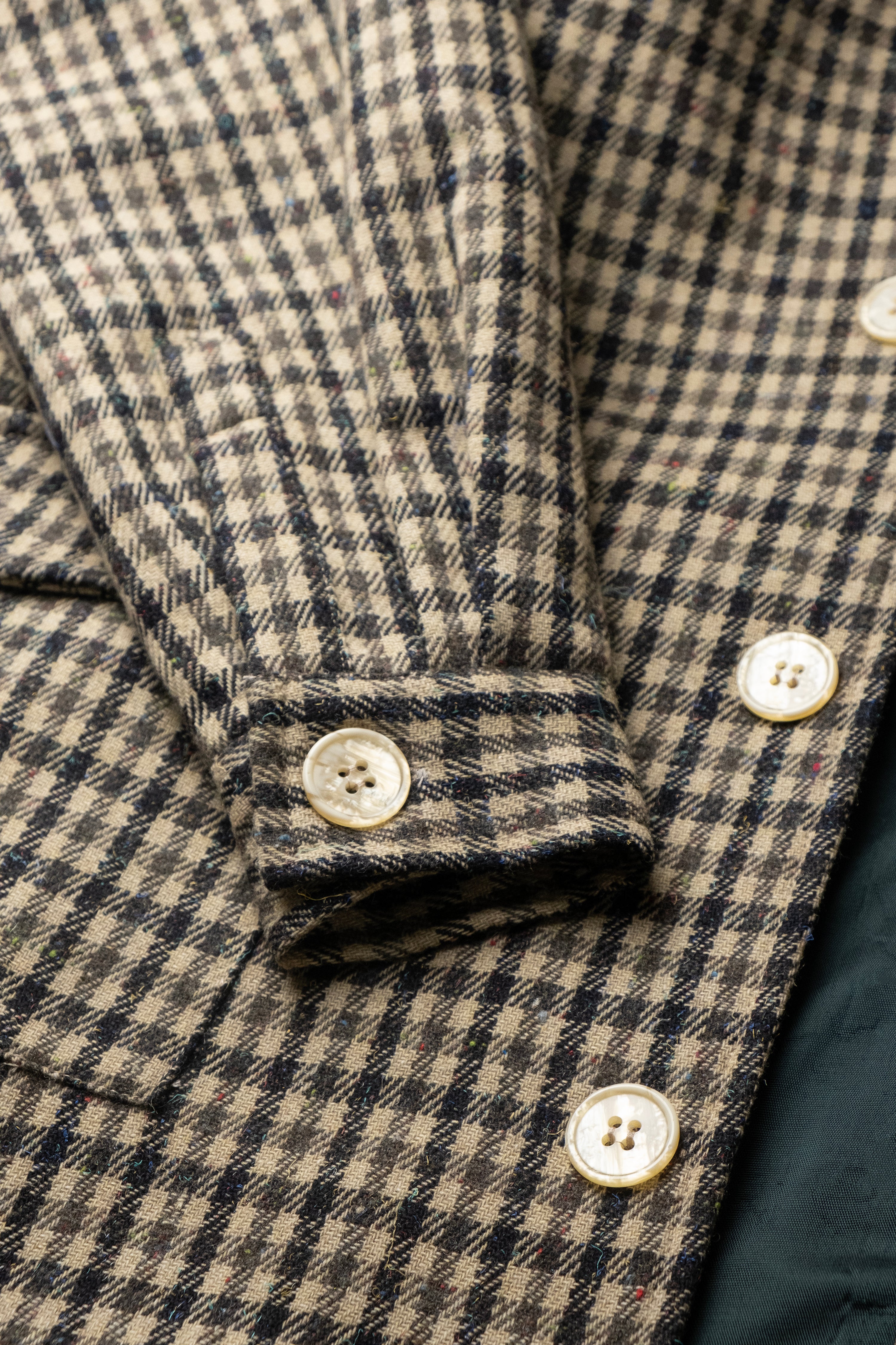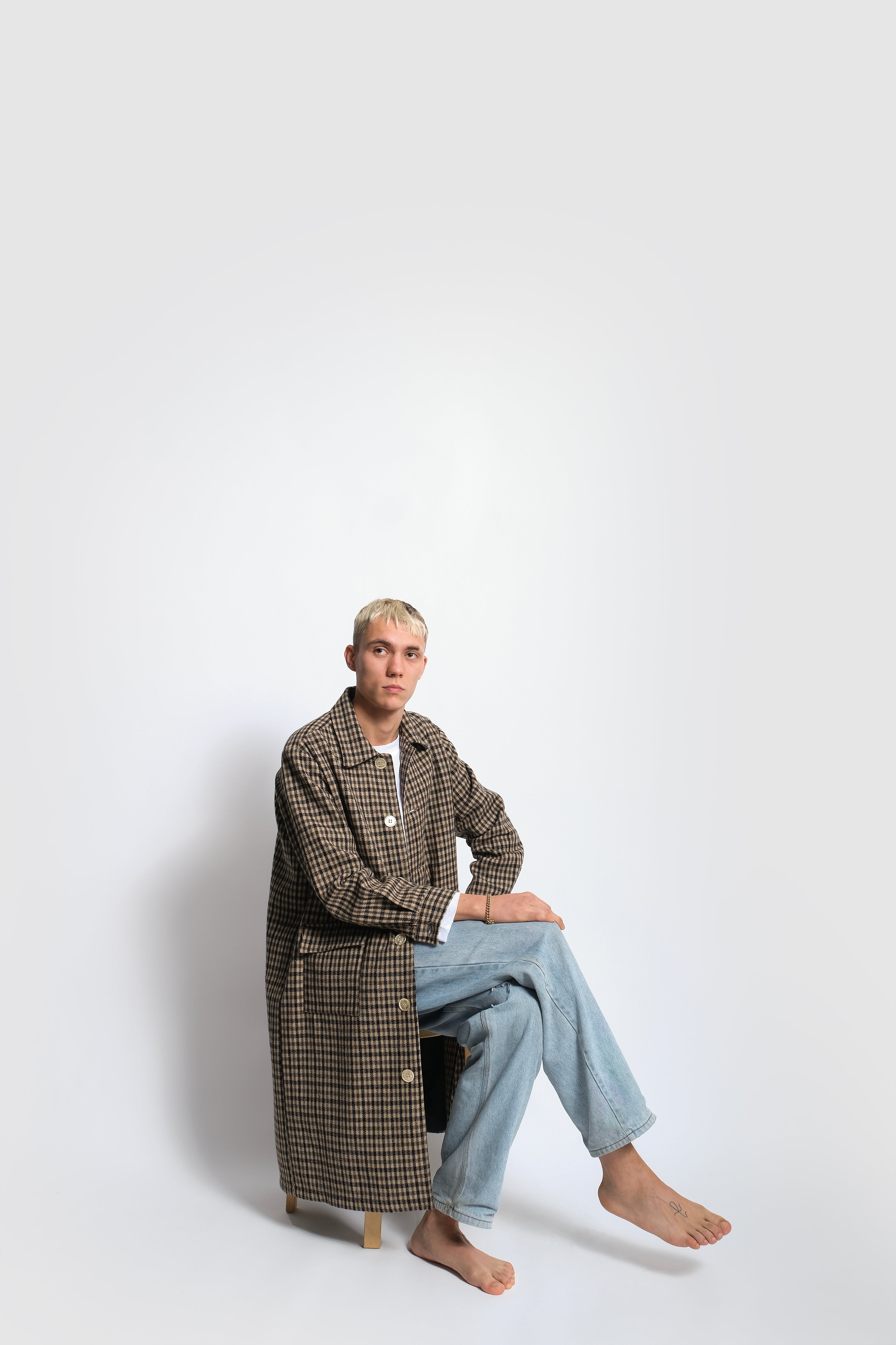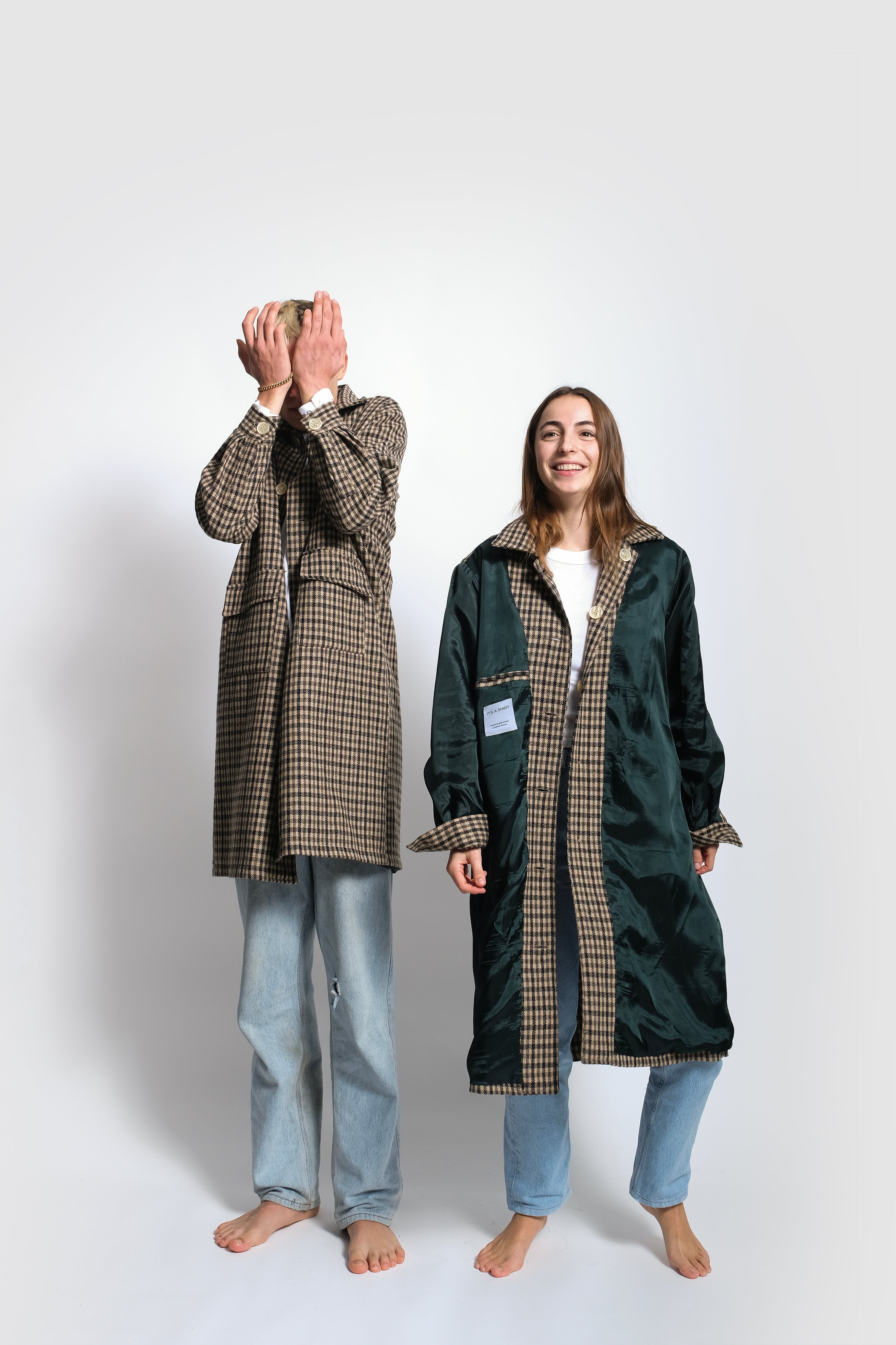 What you see here is a unisex long coat tailored in a premium checked wool from England, lined with a dark green silk/viscose fabric. It is characterised by a wide spread collar as well as by its sleeves that resemble the ones our classic shirt has. It owns also two flapped pockets and another one placed on its left inner side.