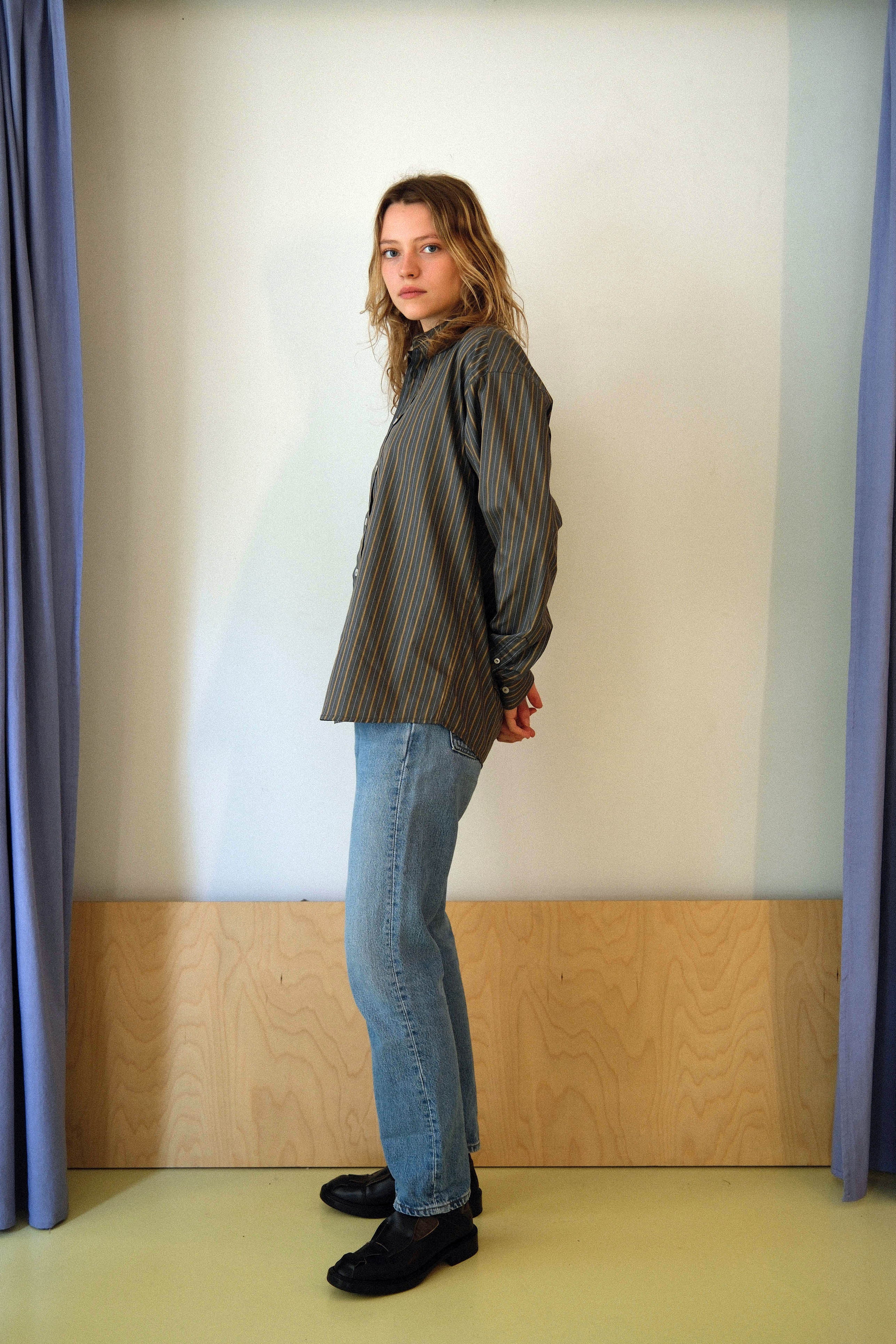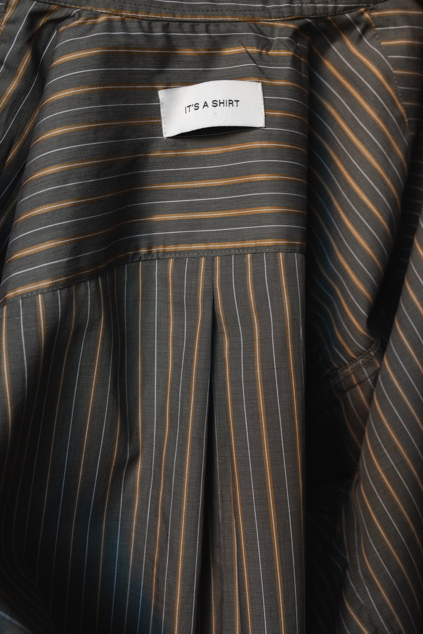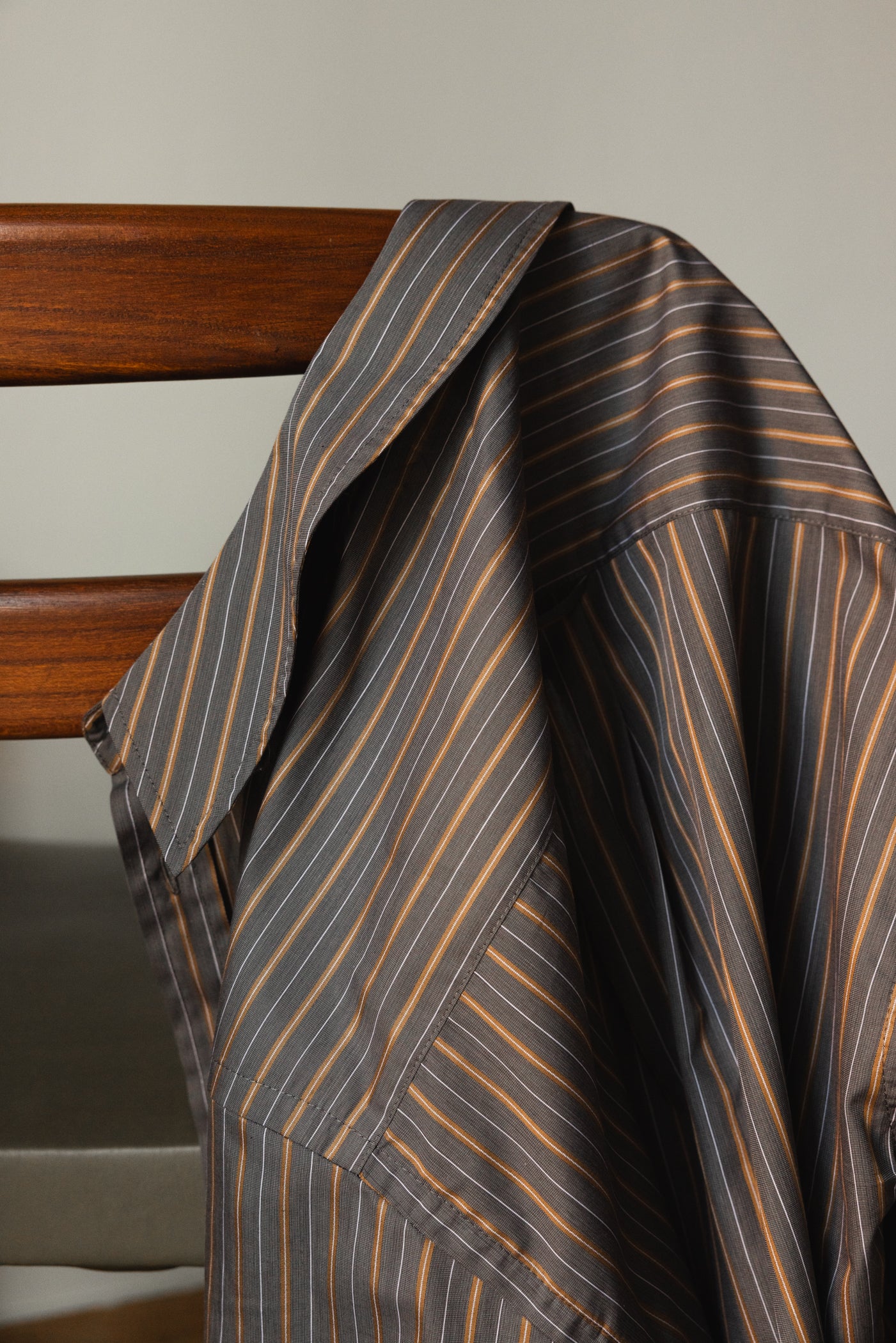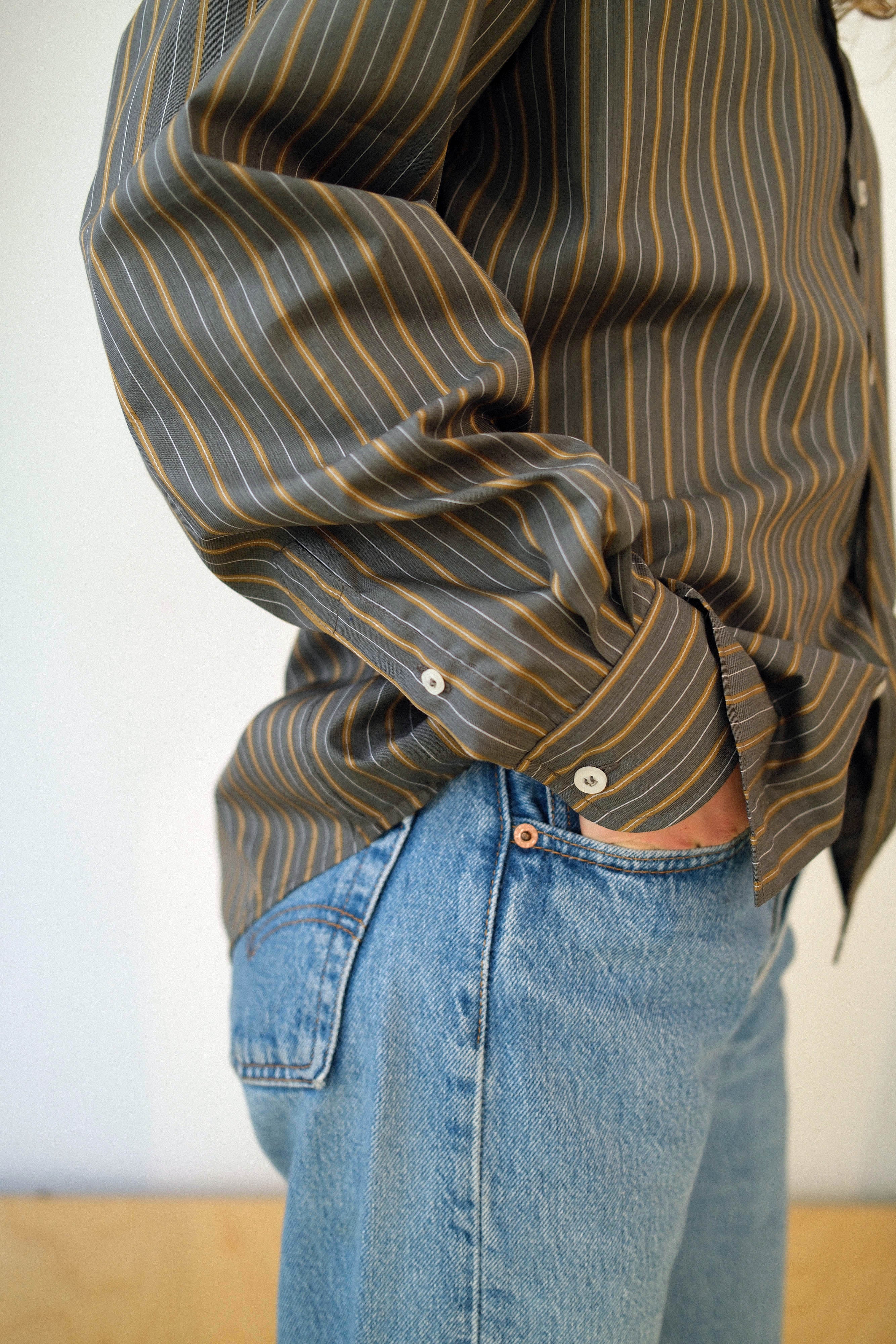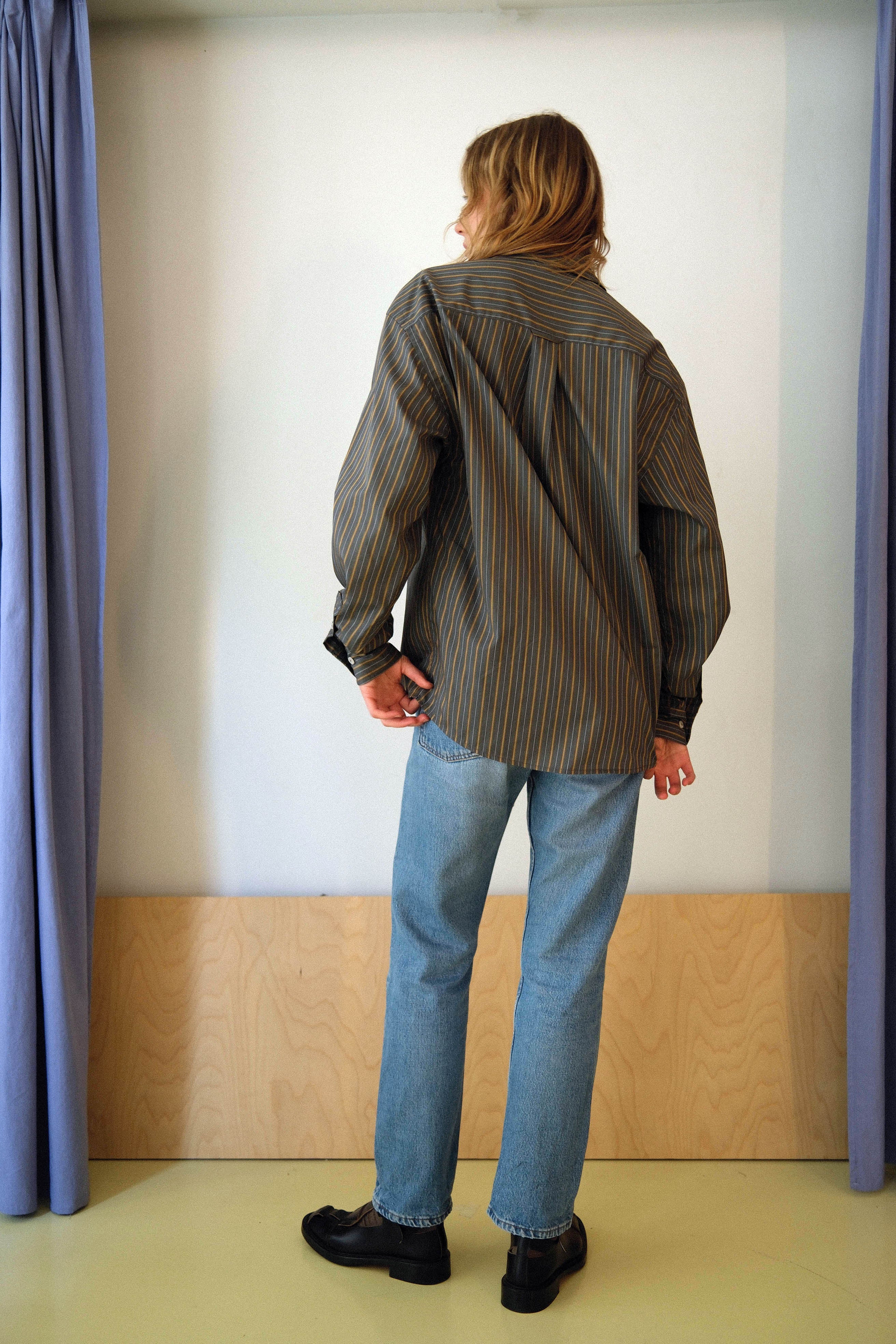 This timeless long-sleeve unisex shirt features a contemporary twisted fit that strikes the perfect balance between relaxed and refined, making it an ideal companion for any occasion throughout the day. Crafted from a soft dark grey Italian cotton with thin beige and white stripes , the shirt shapes a sleek silhouette and is beautifully finished with white matte bone buttons. Each garment is produced in our family-run workshop, ensuring quality and care in every piece. Designed for durability, BOOK CLUB classic is an old school versatile shirt for every season, on any occasion.