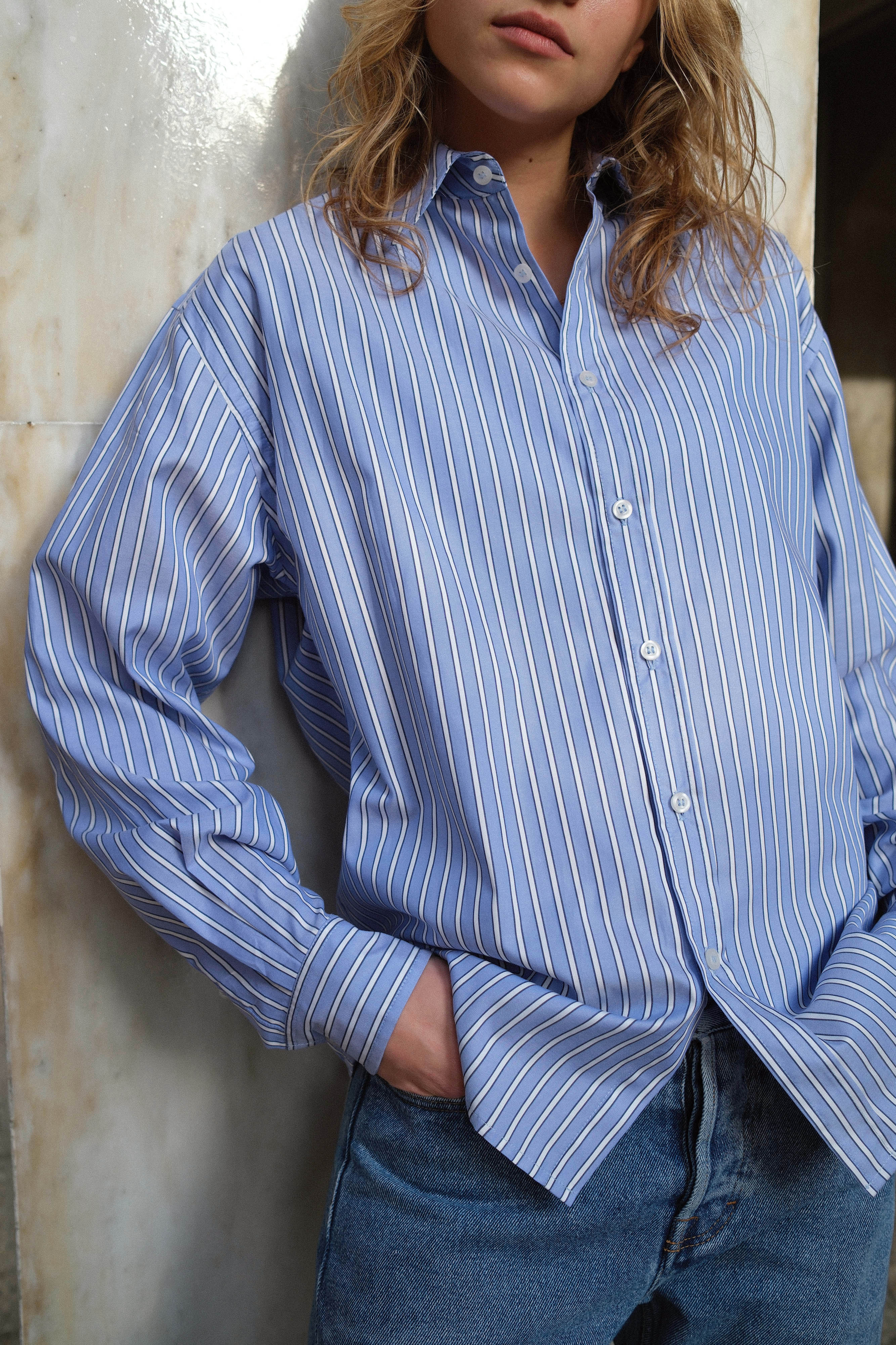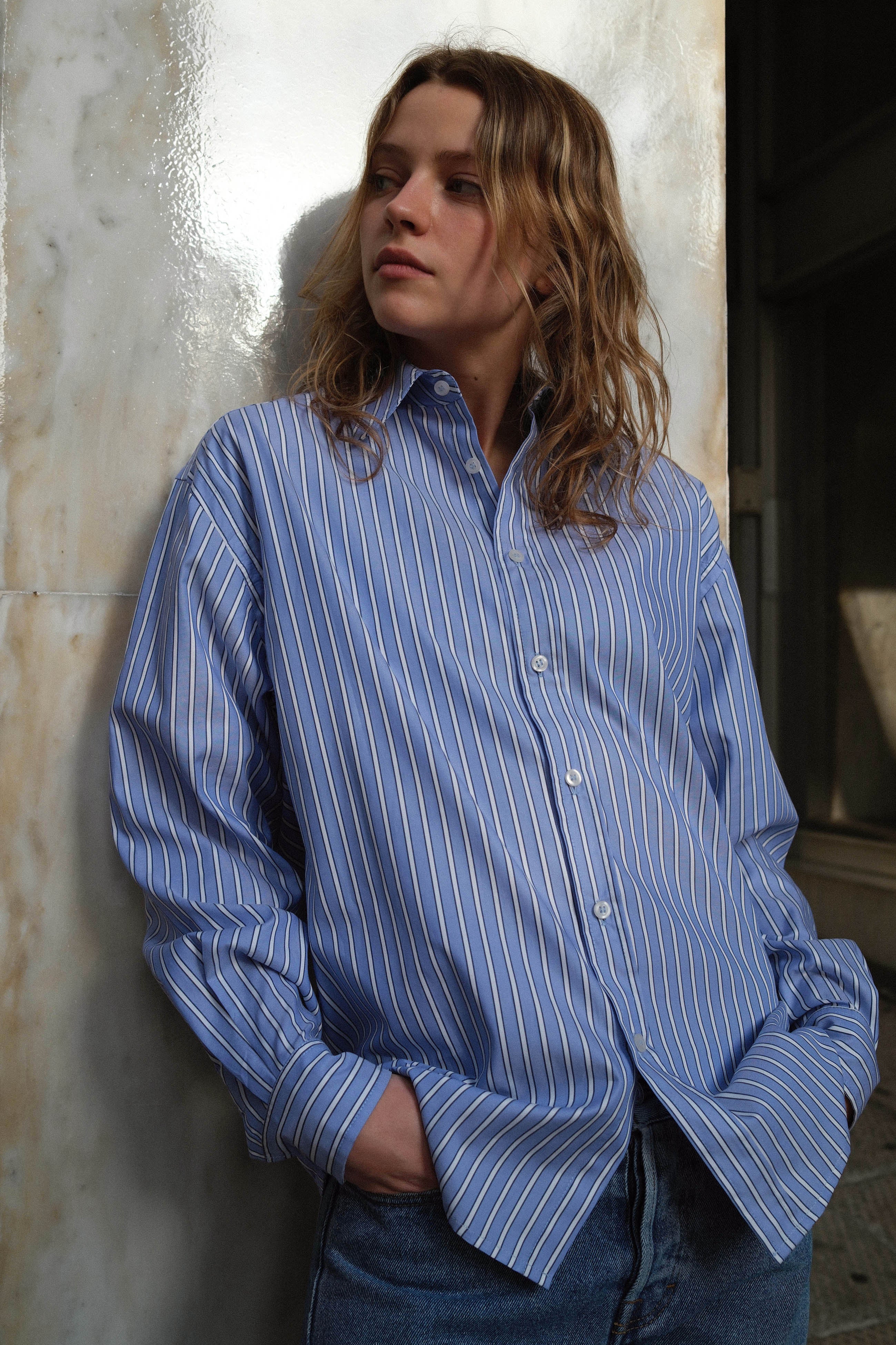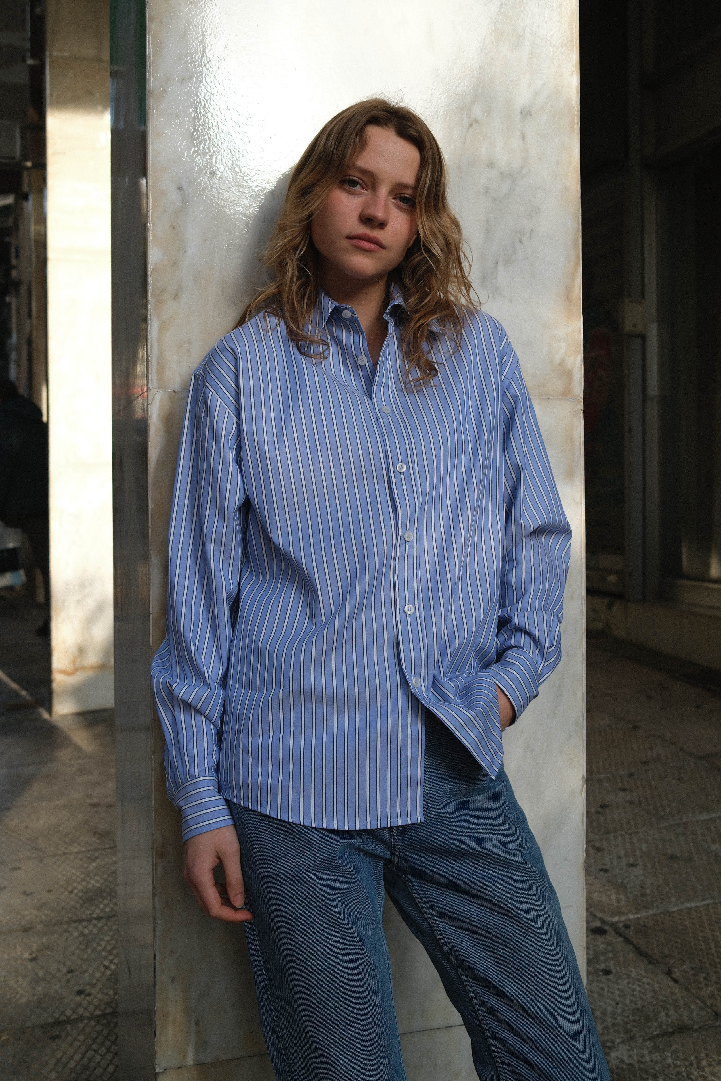 This timeless long-sleeve unisex shirt features a contemporary twisted fit that strikes the perfect balance between relaxed and refined, making it an ideal companion for any occasion throughout the day. Crafted from a light oxford striped cotton from north Italy, the shirt shapes a sleek silhouette and is beautifully finished with white matte bone buttons. Each garment is produced in our family-run workshop, ensuring quality and care in every piece. Designed for durability, CROSS THE OCEAN classic is a versatile shirt for every season, on any occasion.