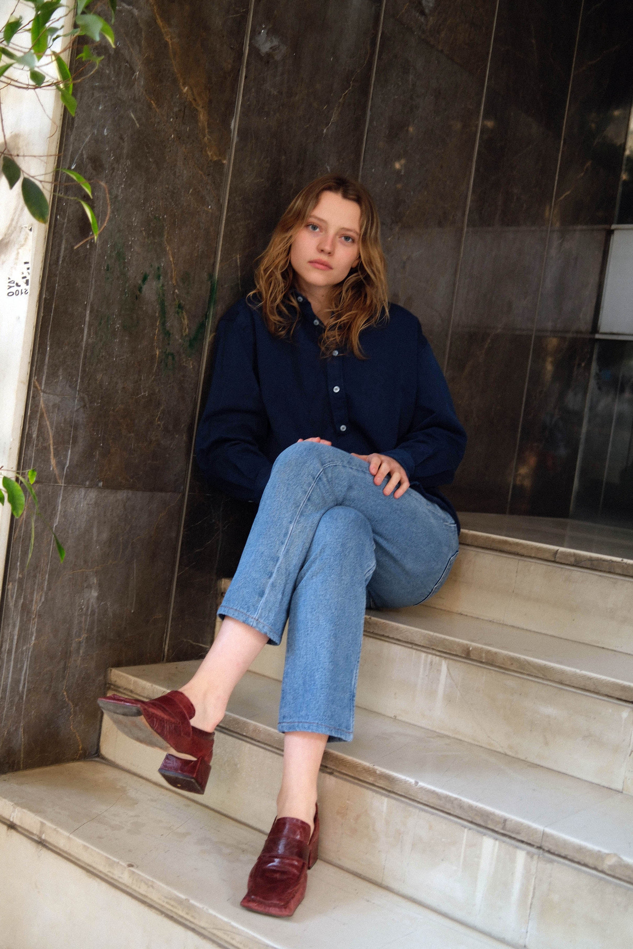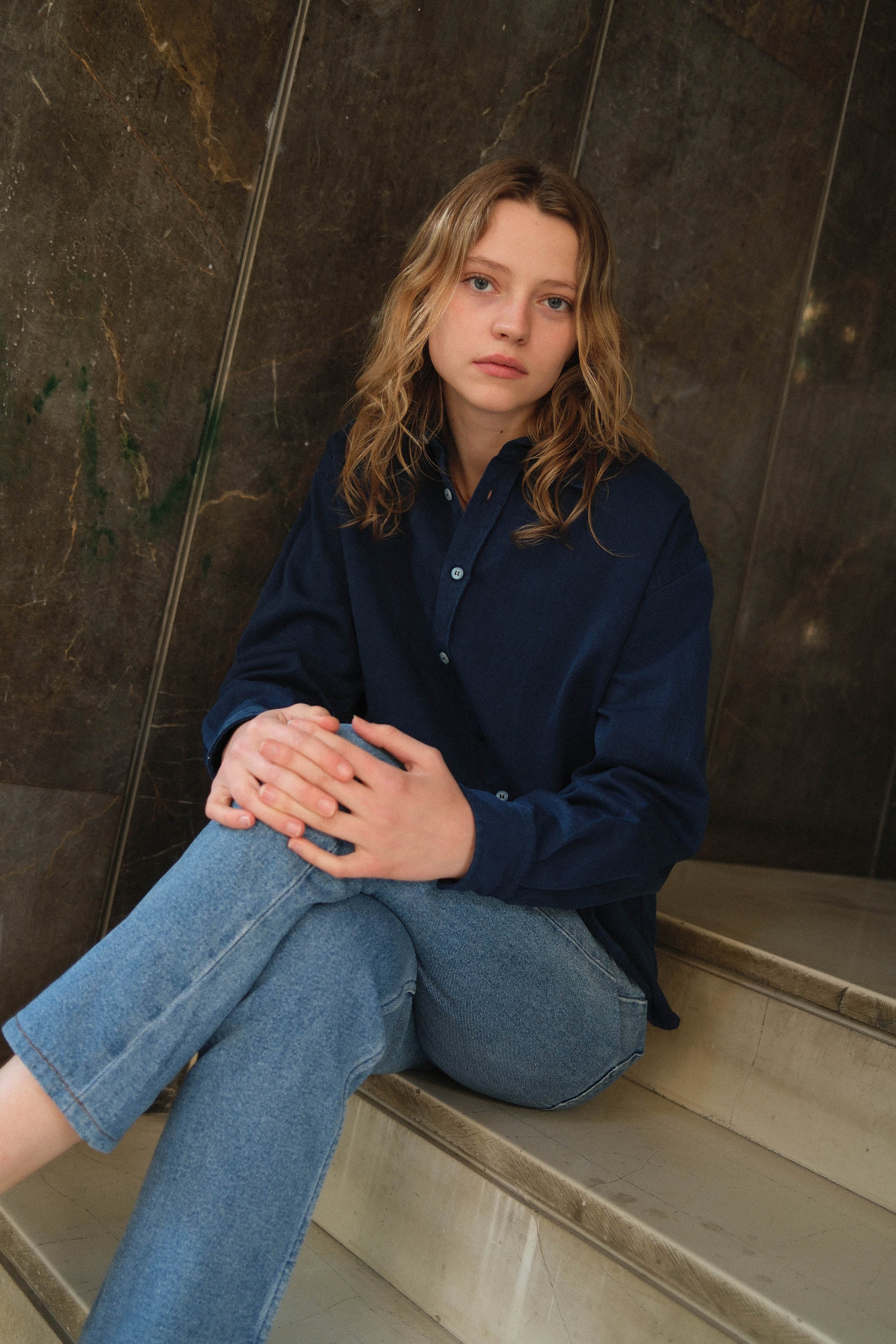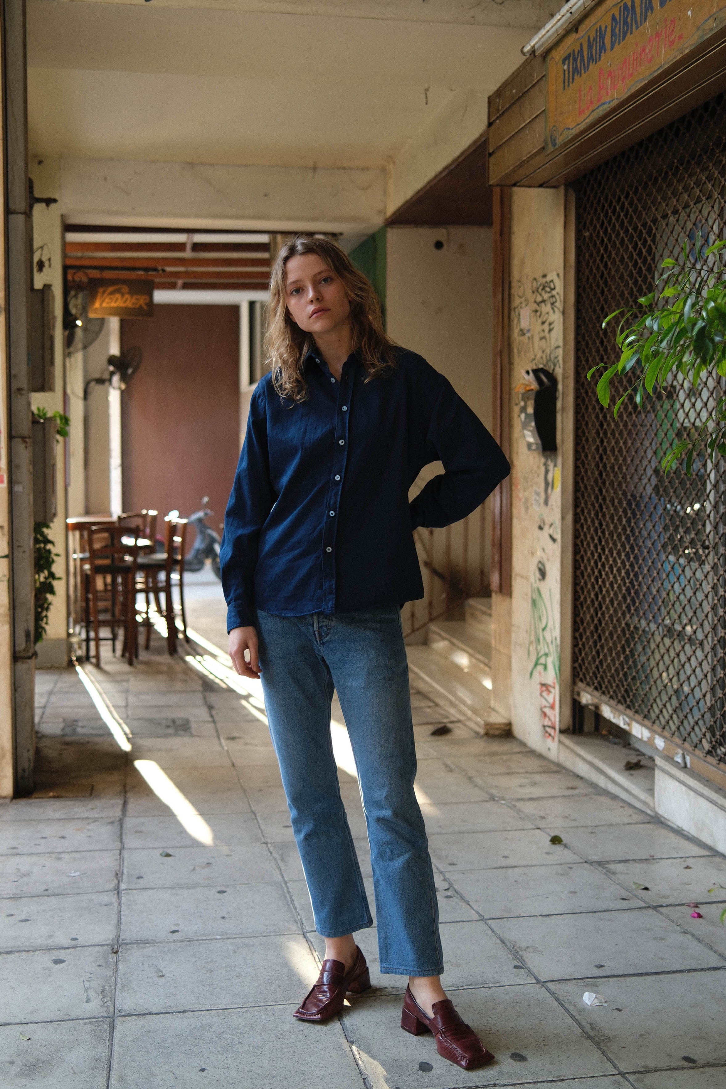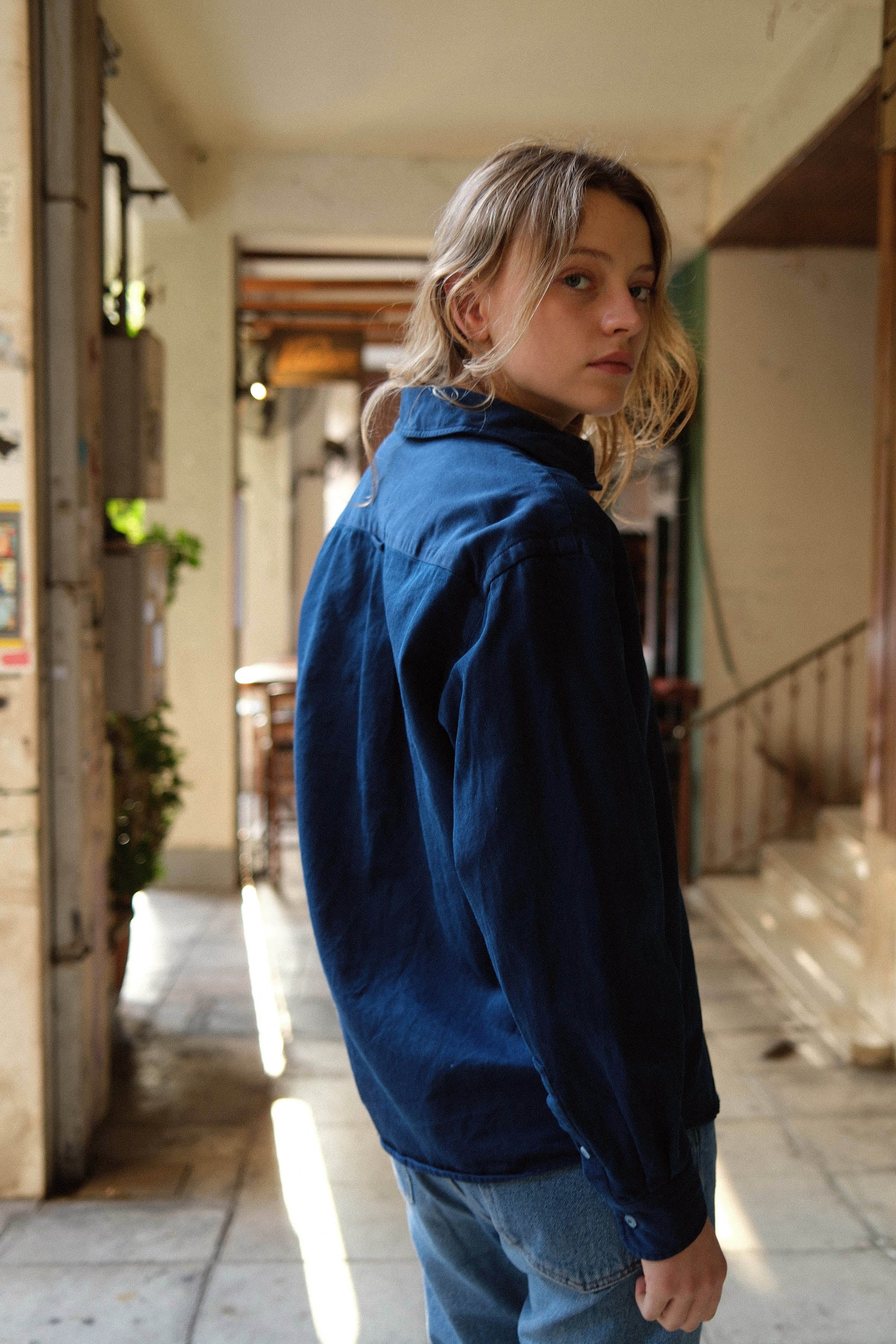 This timeless long-sleeve unisex shirt features a contemporary twisted fit that strikes the perfect balance between relaxed and refined, making it an ideal companion for any occasion throughout the day. Crafted from heavy weight cotton dyed with indigo produced in north Italy, the shirt shapes a sleep silhouette and is beautifully finished with white matte bone buttons. Its fabric reminds of denim. Each garment is produced in our family-run workshop, ensuring quality and care in every piece. Designed for durability, LIKE A DENIM classic is a casual shirt for every season, on any occasion. Note that the garment has been naturally dyed so it can fade out in time. Limited pieces available.