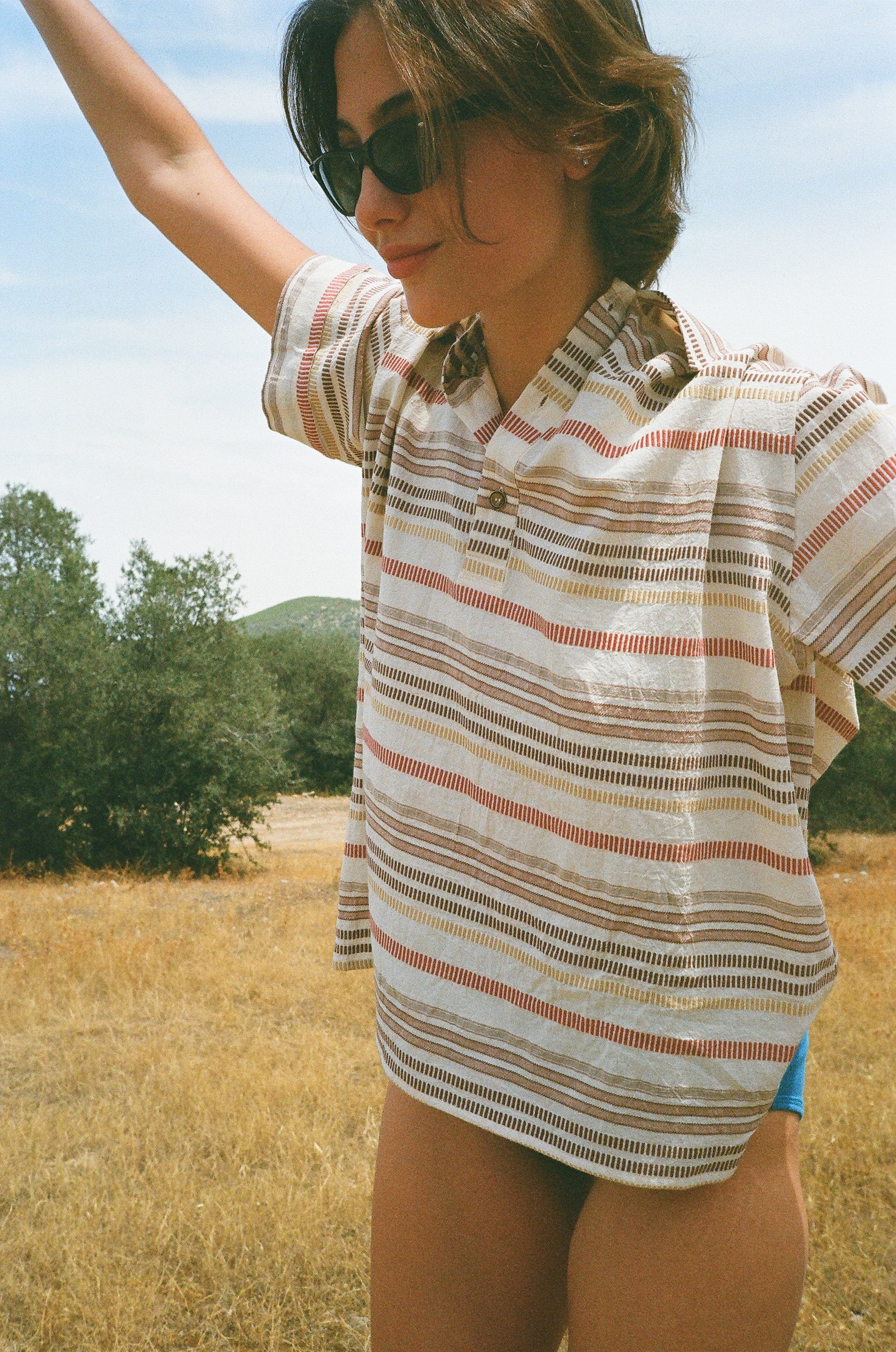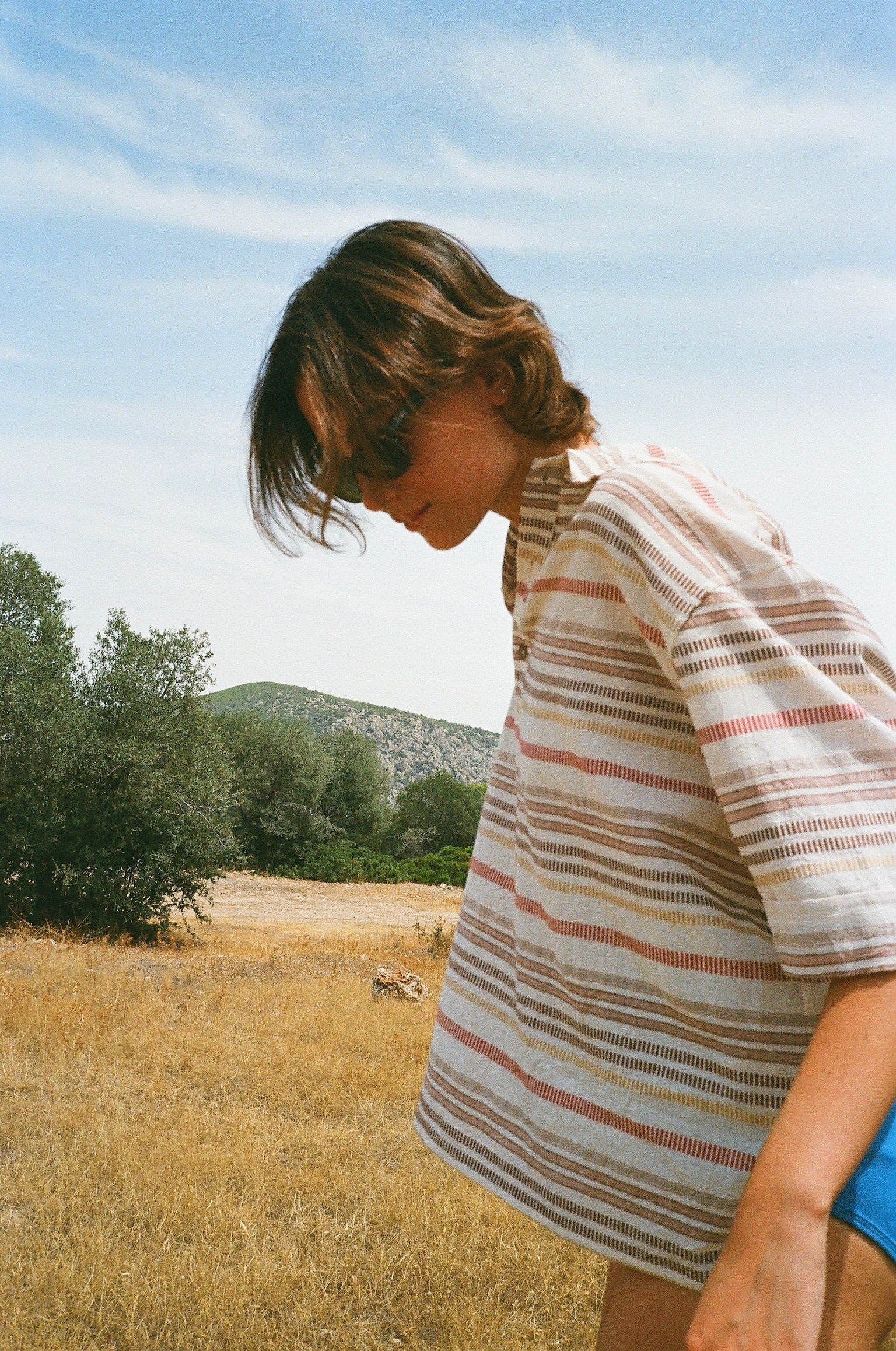 Oatmeal is our first attempt to design a polo shirt. It is crafted from lightweight woven cotton and finished with three buttons. It owns a wide spread flat collar as well as loose boxy fit. The shirt can be accompanied by its matching shorts which has an elasticated waistband and a pair of pockets on the back. The garments are available either separately, or as a set. Limited pieces available. Each and every garment is produced in our family production space located in Athens.