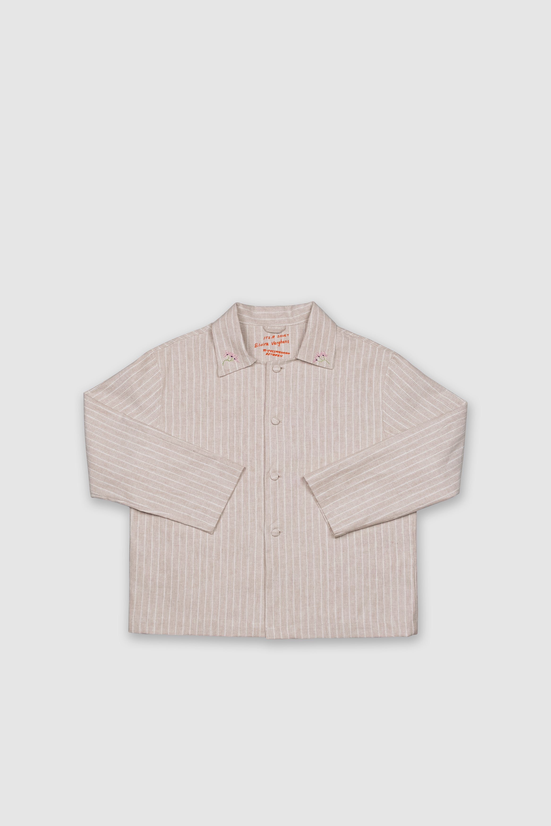 Last November we started a dialogue with Swedish artist Elvira Varghans questing whether is possible to create a workwear shirt with a twist. We exchanged ideas, fabrics and materials via regular post office. The outcome is the production of 24 unique shirts with a distinctive yet a discreet detail. Elvira embroidered each collar by hand in her studio in Malmö. Later, we received them back in Athens and we shaped one-off garments made from greek heavy-weight cotton. Every shirt is unique and has its own embroidery. The inner back is screen printed on the top with our collaboration's signature, handwritten by the artist.