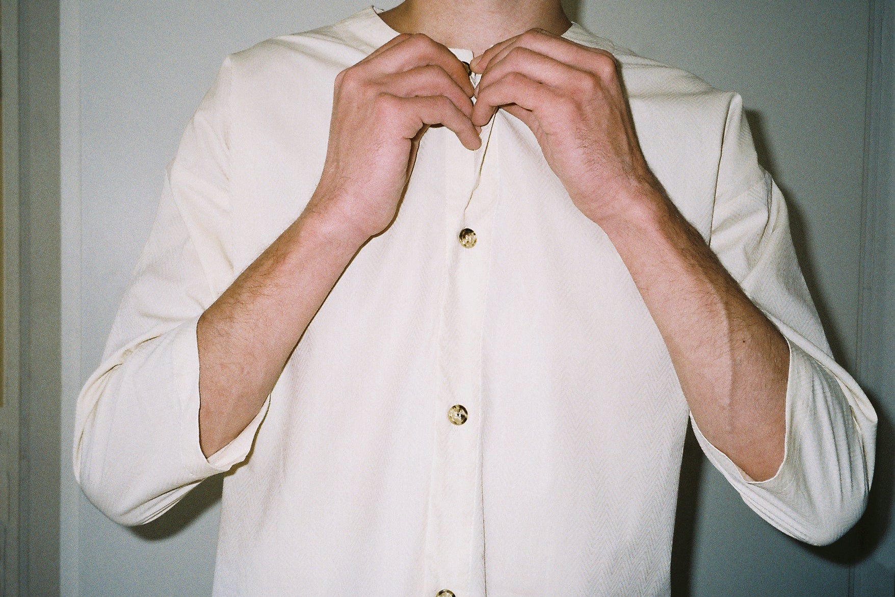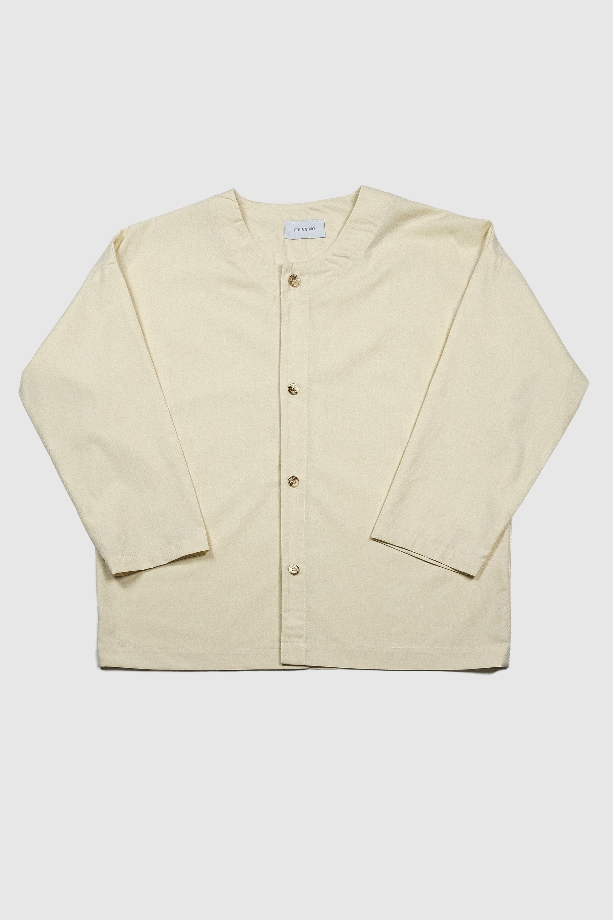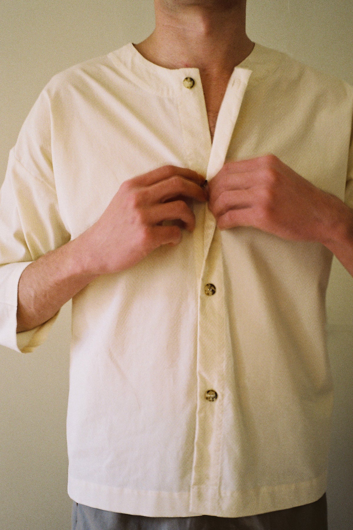 Madagascar Vanilla is a square jacquard shirt with a round neckline. The shape of the garment is formed only by straight lines which offers a unisex and relaxed fit. It is made from dead-stock french beige jacquard cotton with white diagonal lines and finished with white bone buttons. Limited.