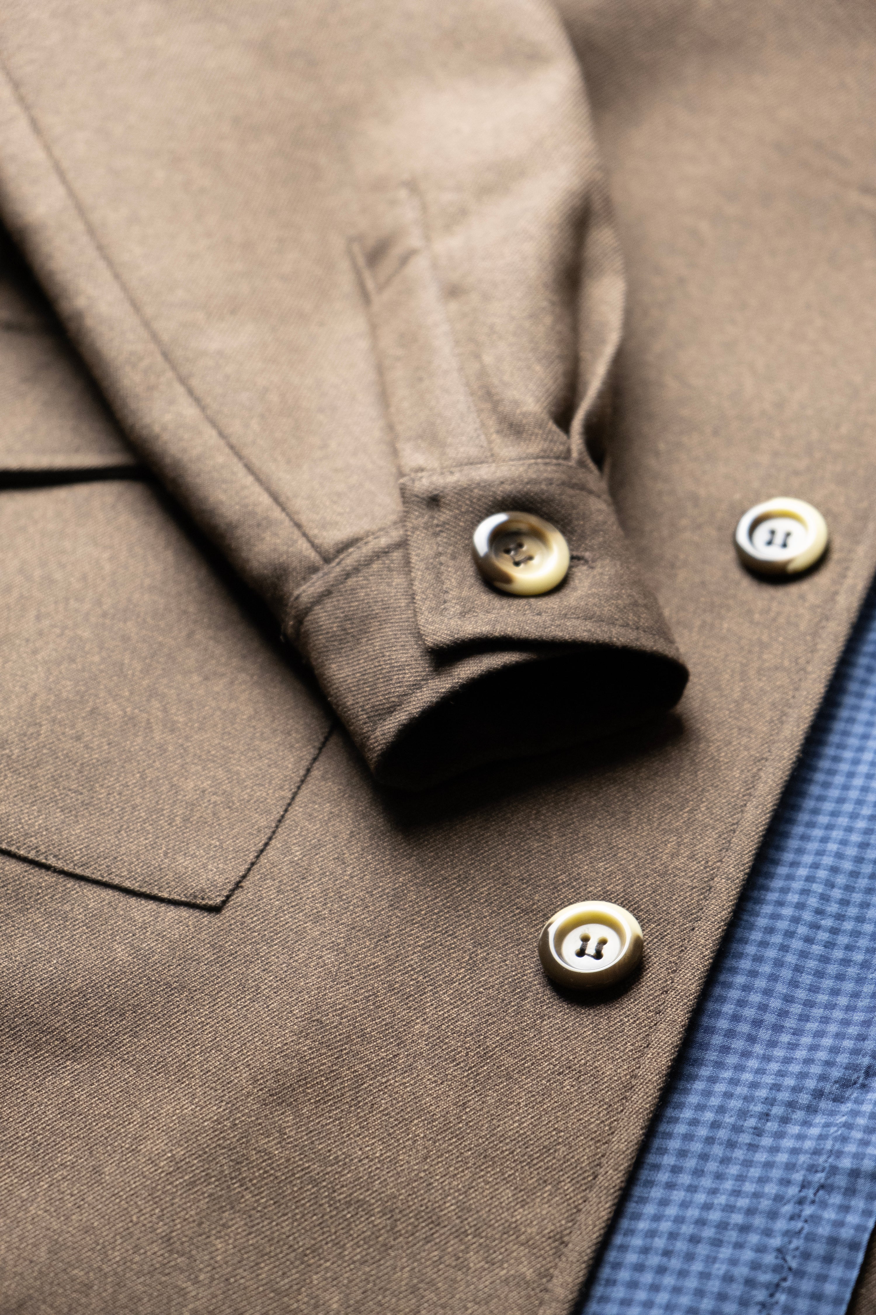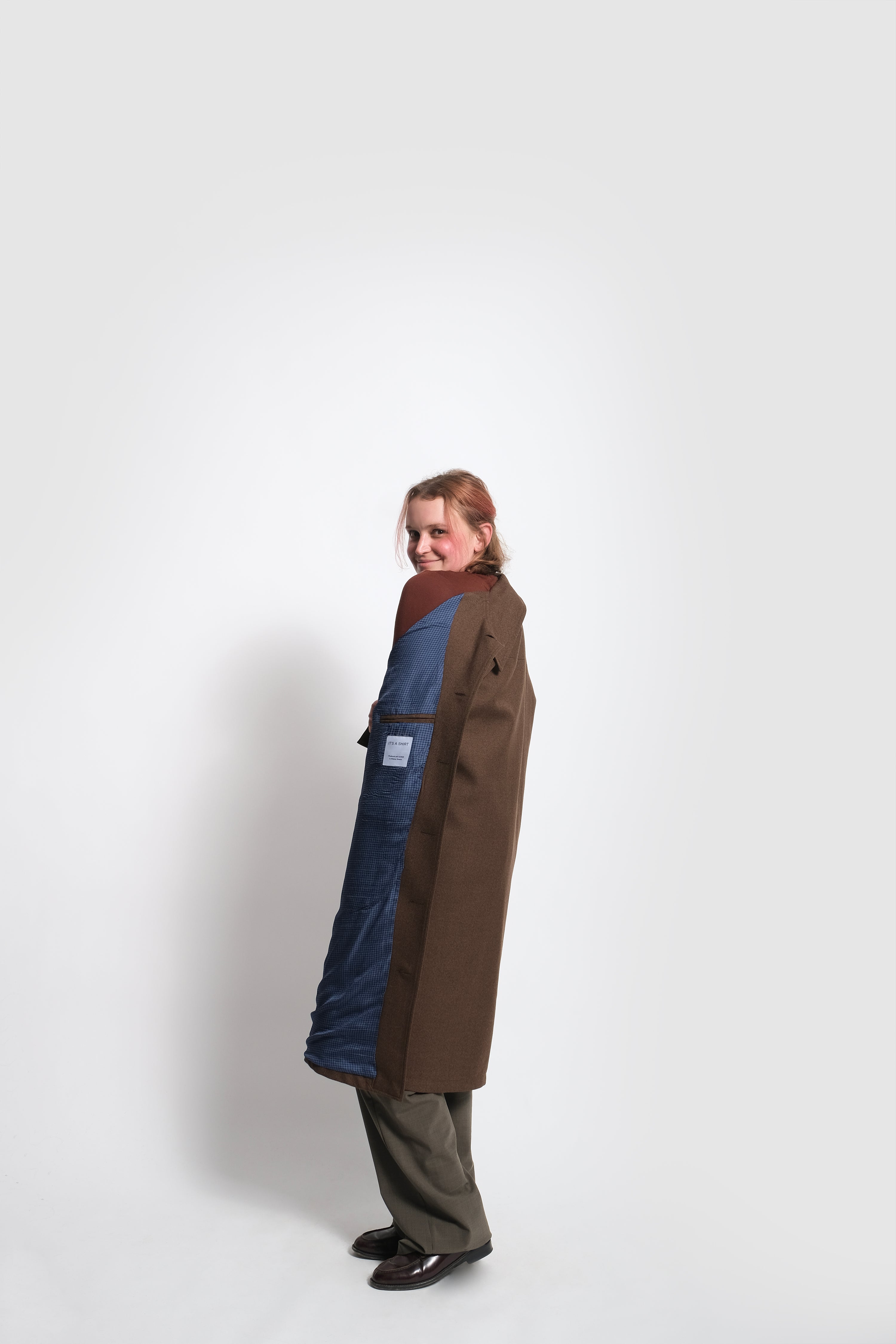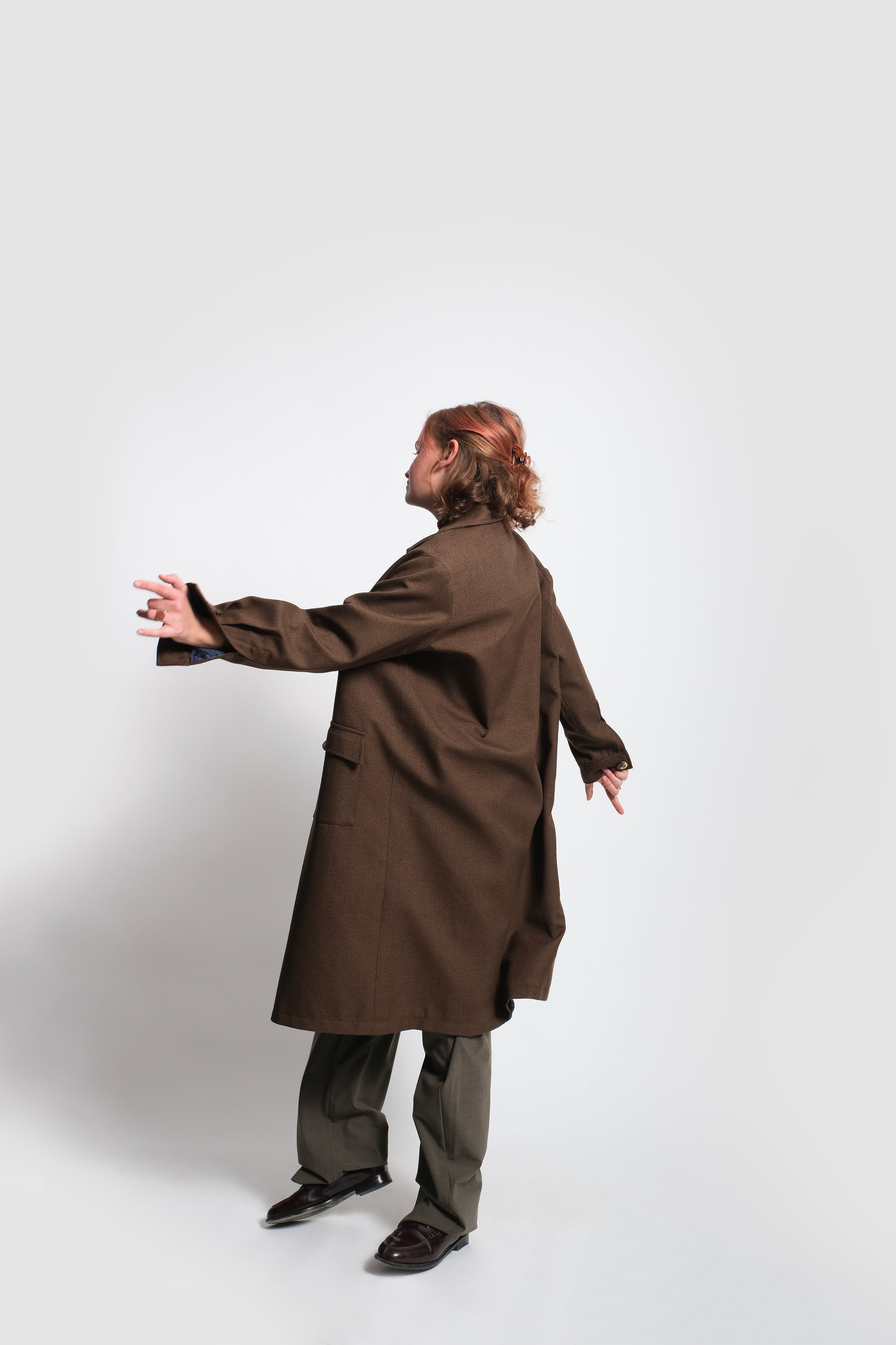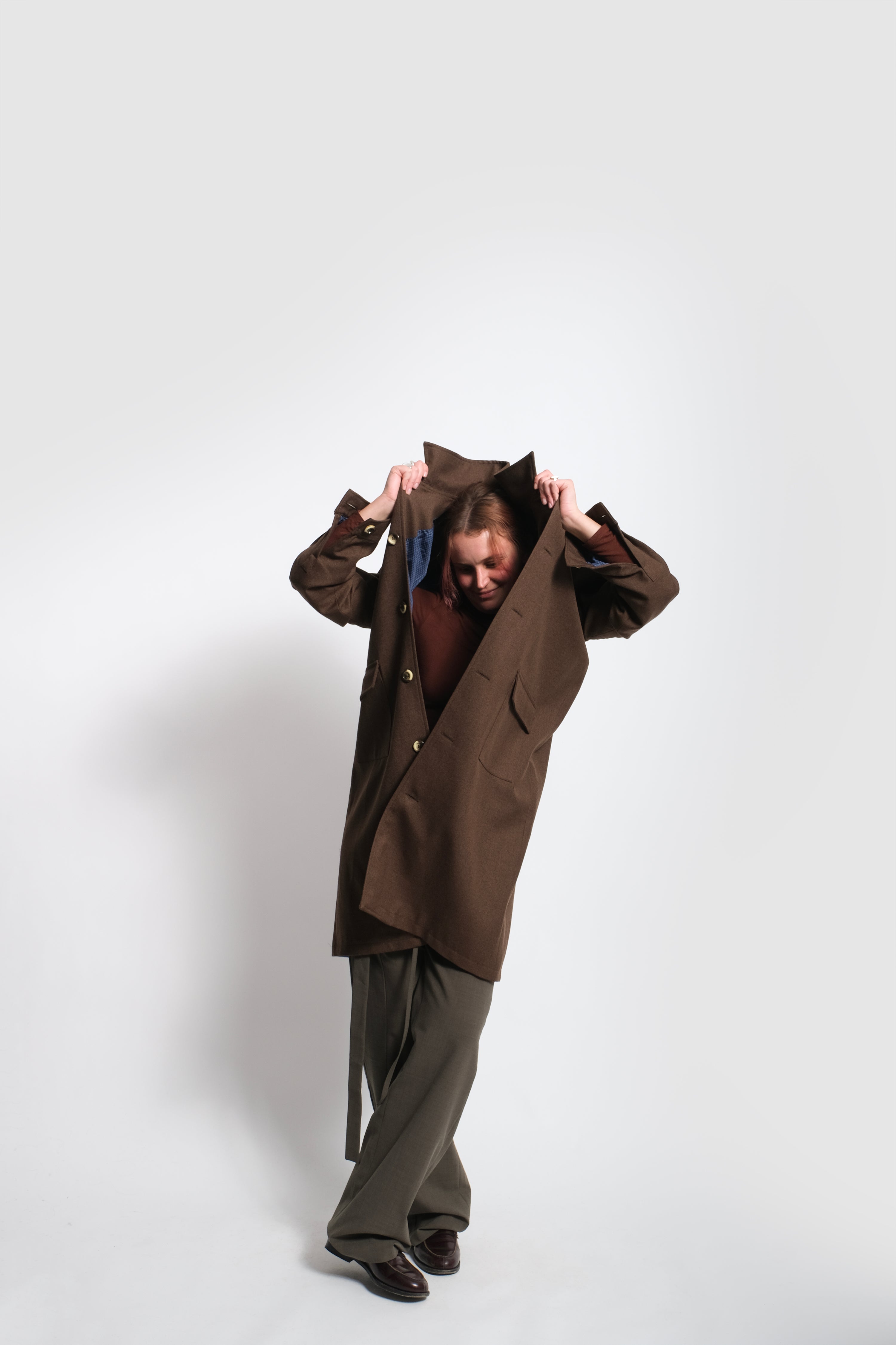 What you see here is a unisex long coat tailored in a premium heavy brown wool from England, lined with a checked silk/viscose fabric. It is characterised by a wide spread collar as well as by its sleeves that resemble the ones our classic shirt has. It owns also two flapped pockets and another one placed on its left inner side.